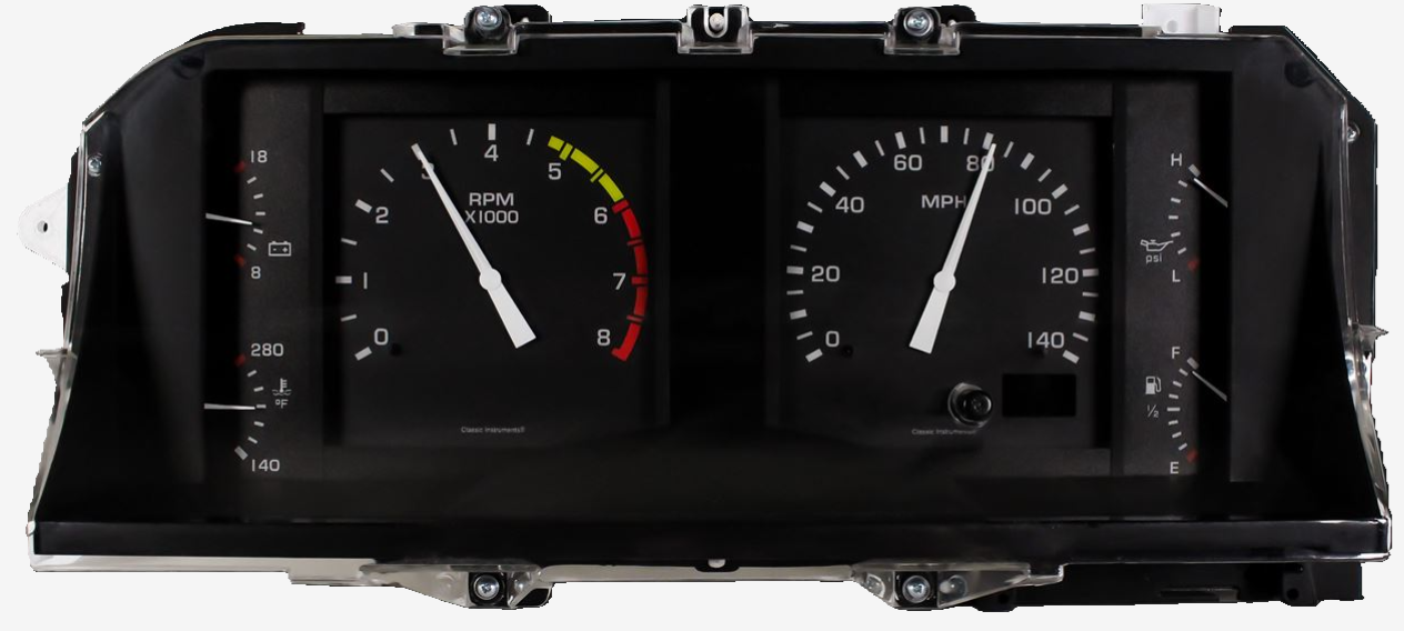 All-electric cluster for ease of programming and installation, OE Style to mimic original gauge cluster look. Hybrid lighting to match the original styling and perimeter lighting and improve visibility with backlighting.