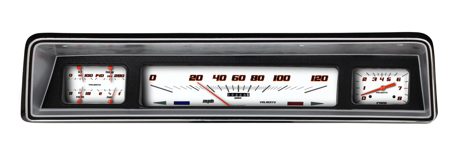 The Velocity White 1966-67 Nova direct-fit cluster features a speedometer, tachometer, fuel level, temperature, oil pressure, and volt gauges; along with indicator lights. All the gauges are electronic operation and the molded plastic housing has been designed with factory fitment in mind. The cluster mounts in the original factory bezel and uses the original diffuser plate, both of which will need to be re-used from your original cluster.