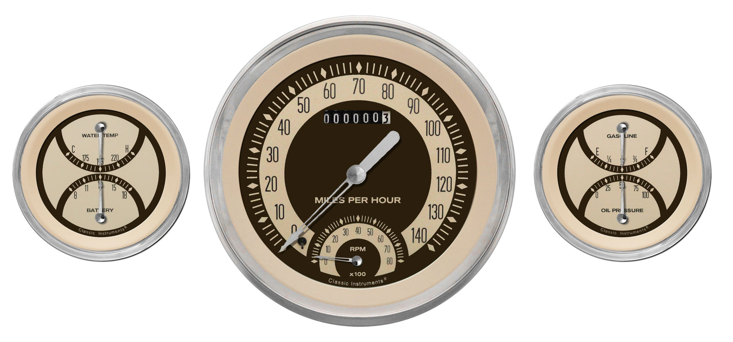 Nostalgia VT Series 4 5/8" Speedtachular (Speedometer/ Tachometer Combination) & 2 Duals with Stainless Low Step Bezels and Curved Glass Lenses.;Speedtachular features a built-in ECM filter signal switch.