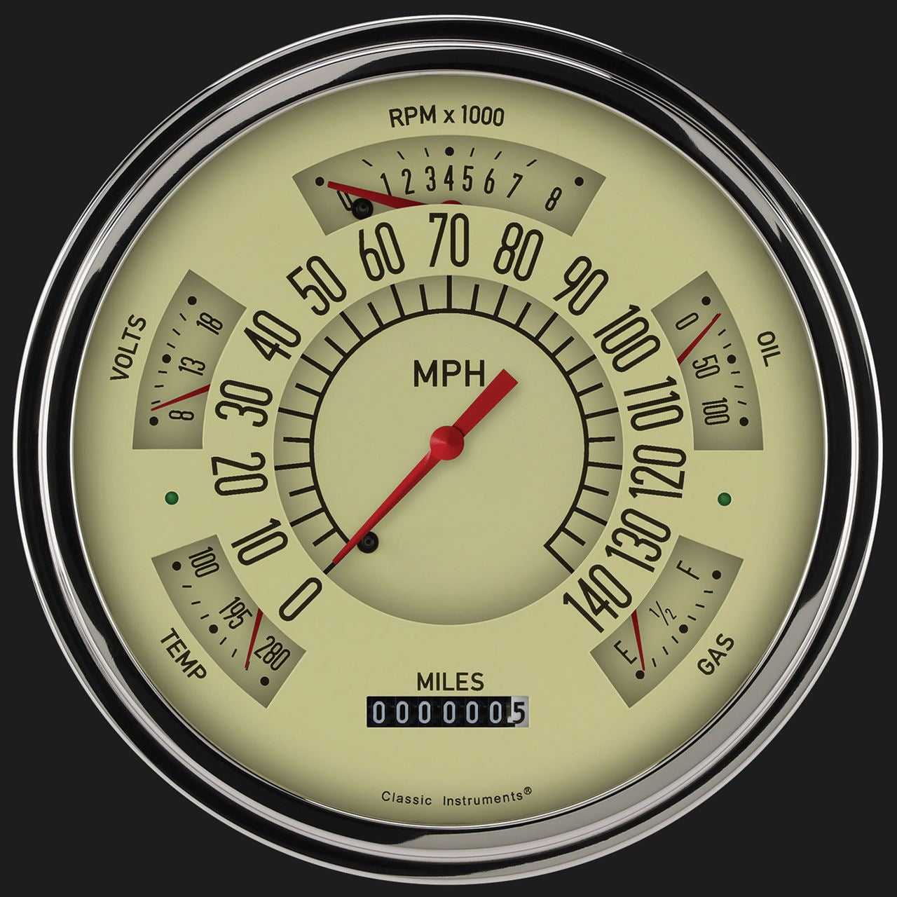 The 6-Pack features the speedometer, tachometer, fuel, temperature, volt, and oil gauges all in one universal fit instrument. Installing the all-electronic cluster is easy with a single harness connection in the back, Classic Instruments' Zeus Speedometer Technology for push button calibration, and all the included sending units.