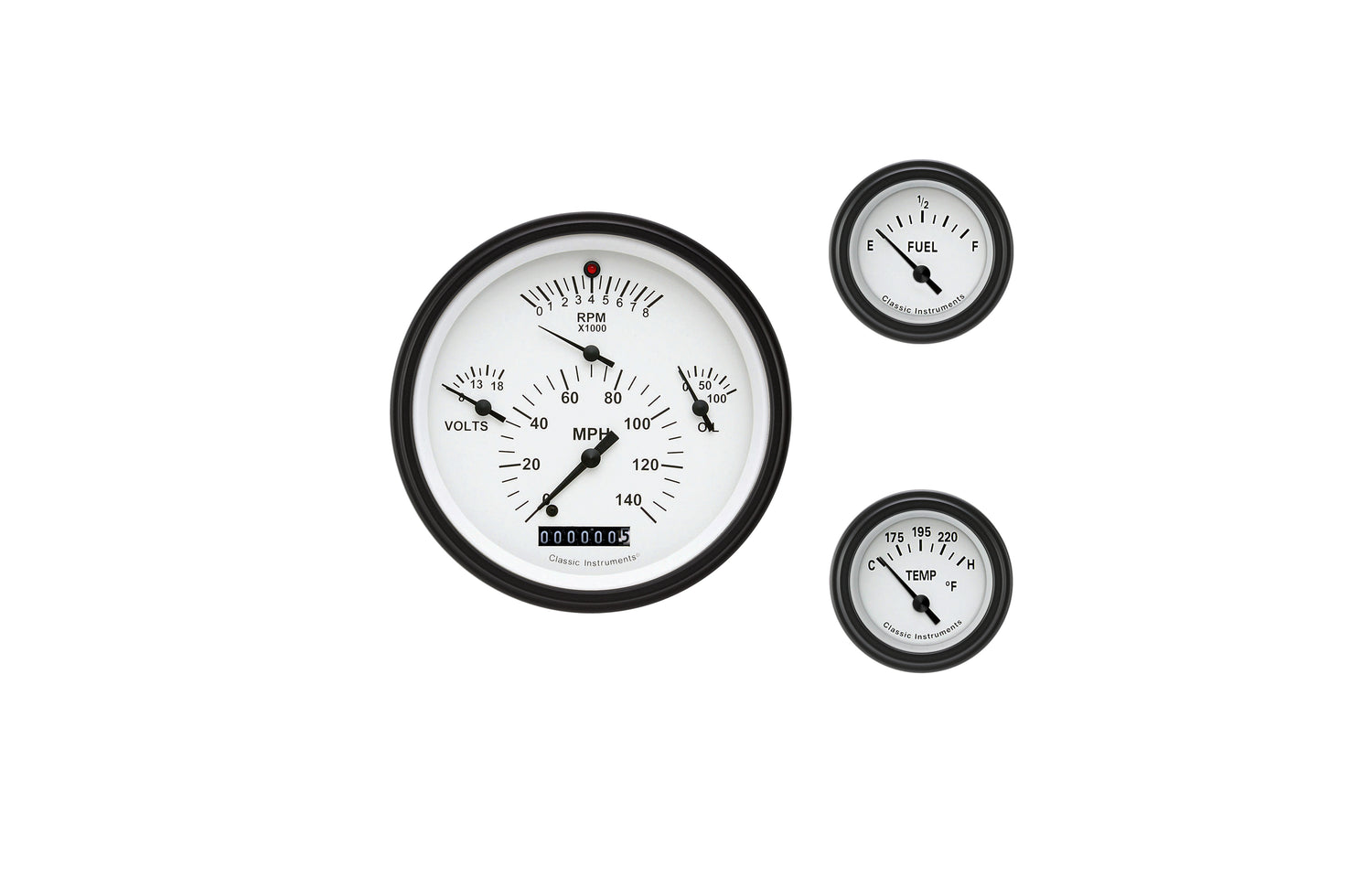 - 1957 Chevy style Tetra Series White Package 4 5/8" Speedometer 140 MPH, Tachometer 8,000 RPM, Oil, Volt, 2 1/8" Fuel (240-33 OHM) & Volt with