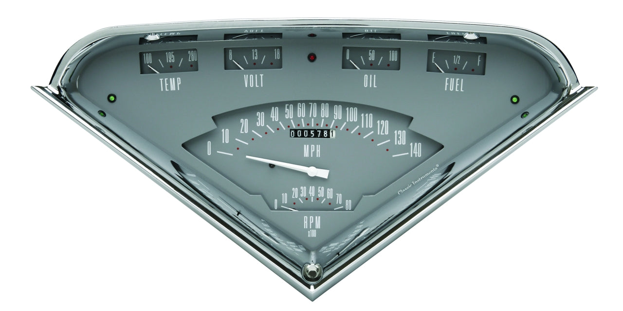 The 1955-59 Chevy Truck Tach Force Package, features a dual layer design with 140 MPH Speedometer, 8,000 RPM Tachometer, Fuel (0-30 OHM), Oil, Temp, and Volt gauges with LED turn signals, high beam indicator, and built-in ECM filter signal switch. The package includes, installation hardware, all necessary* sending units, and a single-connection wiring harness constructed of automotive grade TXL wire, machine-crimped terminals, tech-flex sleeving, and Molex main connector. It includes ZST™ and works directly with ECM or VSS signals so no additional control box is needed.The cluster also features a built-in dimmer switch and fuel-sender-selector switch for compatibility with any sending unit.**Bezel not included.