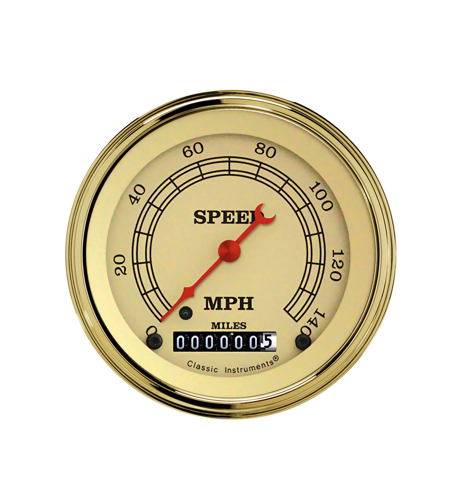 - Vintage 3 3/8" Speedometer 140 MPH with Gold Stainless Low Step Bezel Curved Glass Lens