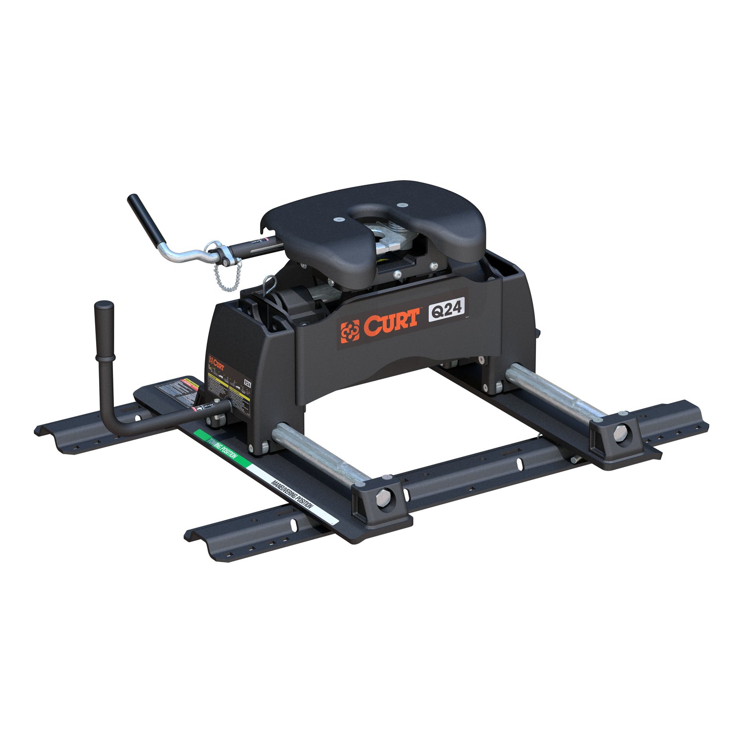 The CURT Q24 is the heavyweight champion of 5th wheel hitches. With a gross trailer weight capacity of 24,000 lbs. and a vertical load limit of 6,000 lbs., the Q24 is capable of handling the heaviest of 5th wheel trailers, including deluxe RV and oversize campers. Something that sets the Q24 5th wheel hitch apart from competitive models is its spherical axial bearing. Instead of having a set of rods on which the hitch head can pivot, the Q24 uses a spherical bearing to allow the hitch head to pivot in virtually any direction. This means smoother turns, a quieter ride and less strain on your towing equipment and truck. The CURT Q24 5th wheel trailer hitch also features dual-locking jaws, a self-aligning head, single-handle operation and a three-position coupling indicator. It comes with a durable carbide powder coat finish, a limited lifetime warranty and is tested in accordance with SAE J2638 for safety. This 24K 5th wheel hitch head comes attached to the CURT R24 slider and a set of 5th wheel rails to be mounted in your truck bed using a 5th wheel bracket kit. CURT 5th wheel sliders feature solid construction and offer a sturdy mounting place for your 5th wheel hitch, ensuring that none of its towing strength is lost. CURT 5th wheel sliders are also true rolling units, meaning they actually roll on wheels that bear the weight of the trailer rather than simply sliding on hollow rods as seen in competitive models. With a thick operating handle, the roller smoothly rolls the 5th wheel head forward and back, locking securely into each position as desired. CURT sliders also provide up to 12 in. of displacement as well, unlike the more common 10 in., to give you a wide range of motion and plenty of space to get your RV or other 5th wheel trailer around any turn. Certain turret-style pin boxes, such as Sidewinder, are not compatible with CURT Q-series hitches and should not be used as they may create vehicle / trailer handling hazards.
