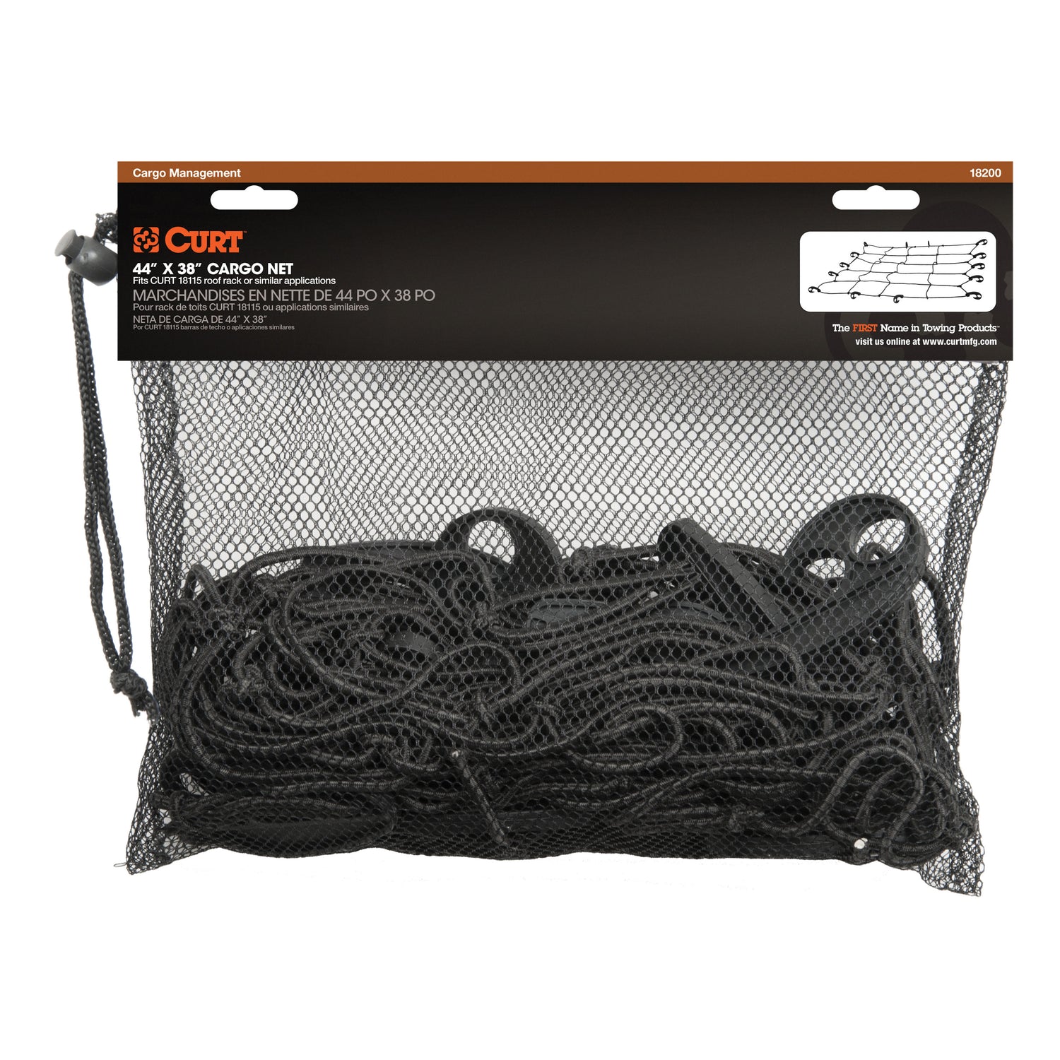 Even with the roomiest of vehicles, packing the car for a long trip can quickly turn into a frustrating game of Tetris. CURT cargo carriers are a simple yet effective solution for maximizing the storage area of your vehicle. CURT cargo carrier nets are the simple, effective way to secure your cargo. Using a series of ropes or bungees to keep your cargo in place isnt always effective. Ropes can be a nuisance to unravel and remove from your trailer, while bungees can be unreliable. CURT cargo carrier nets combine the convenience of a bungee cord with the effectiveness of a rope. Our cargo nets feature a series of hooks that latch onto your cargo carrier and provide a taut netting across your items. This cargo net measures 44 in. x 38 in. and is designed to fit over the CURT roof rack cargo carrier (without extension). Whether you prefer the hitch-mounted carrier or the roof rack option, CURT has cargo management solutions to meet your needs.