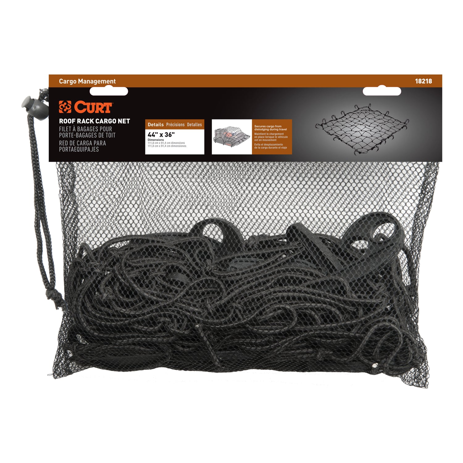 Even with the roomiest of vehicles, packing the car for a long trip can quickly turn into a frustrating game of Tetris. CURT cargo carriers are a simple yet effective solution for maximizing the storage area of your vehicle. CURT cargo carrier nets are the simple, effective way to secure your cargo. Using a series of ropes or bungees to keep your cargo in place isnt always effective. Ropes can be a nuisance to unravel and remove from your trailer, while bungees can be unreliable. CURT cargo carrier nets combine the convenience of a bungee cord with the effectiveness of a rope. Our cargo nets feature a series of hooks that latch onto your cargo carrier and provide a taut netting across your items. This cargo net measures 44 in. x 36 in. and is designed to fit over the CURT roof rack cargo carrier #18123 (without extension). Whether you prefer the hitch-mounted carrier or the roof rack option, CURT has cargo management solutions to meet your needs.
