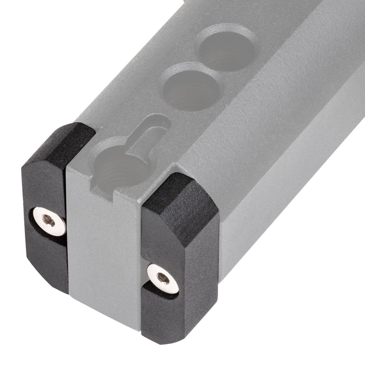 This CURT replacement adapter kit contains two adapter inserts that bolt onto the base of the CURT gooseneck RockerBall #60654 to allow it to fit B&W brand Turnoverball gooseneck hitches. The kit includes two steel inserts and two bolts.