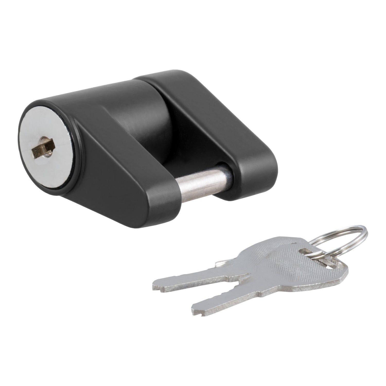 Sometimes a safety pin and coupler latch are just not enough to keep your toys safe. While CURT safety pins and coupler latches are made to keep your coupler securely latched onto your trailer ball, they are no substitute for the locking power provided by a CURT coupler lock. CURT coupler locks are designed to add security to your trailer and towing equipment. Instead of merely retaining the coupler latch mechanism, they lock it into place and greatly deter any tampering and theft of your trailer while it is coupled to your vehicle. CURT coupler locks are key-operated and come in several different styles for you to choose from. This coupler lock features a padlock design to keep the pin well protected from tampering. It comes with a black finish and offers a pin span of 3/4 in. with a pin diameter of 1/4 in.. All CURT coupler locks are made to fit latch-type couplers and include two keys. Protect your boat, your camper and even your utility trailer the right way with a CURT coupler lock.
