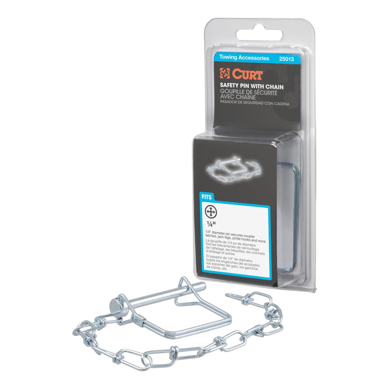 CURT safety pins go beyond the simple function of keeping your coupler latch secure. They are constructed from quality materials and have a universal design that allows them be used for a variety of purposes in your towing setup. CURT safety pins are made from solid steel to provide more than enough strength to keep your trailer coupler latched down tight. The zinc plating that we use to finish our safety pins offers excellent protection against rust and corrosion. This is necessary for any trailer because of its frequent exposure to the elements. The user-friendly design of our safety pins allows them to be easily handled while maintaining effective security. This safety pin has a pin diameter of 1/4 in. and includes a 12 in. chain attachment to mount onto your trailer coupler and prevent the safety pin from being misplaced. Use CURT safety pins for securing trailer couplers, jacks, caster wheels and more. When you couple your trailer to your vehicle, nuts and bolts just do not cut it. Secure your towing equipment right with a safety pin from CURT.