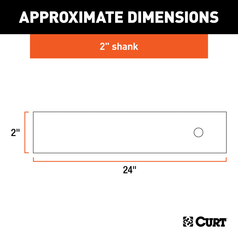 For the do-it-yourselfer, CURT offers an entire line of towing fabrication components to supply you with the quality building blocks you need. These raw steel components are made from solid steel for maximum strength, and they come ready to be welded together in whatever form you need to get the job done. This fabrication steel hitch bar features a standard 2 in. x 2 in. shank and comes with rounded corners for easier mounting. It has an overall length of 24 in. and comes with a pre-drilled hole in the shank to accept a hitch pin and clip.