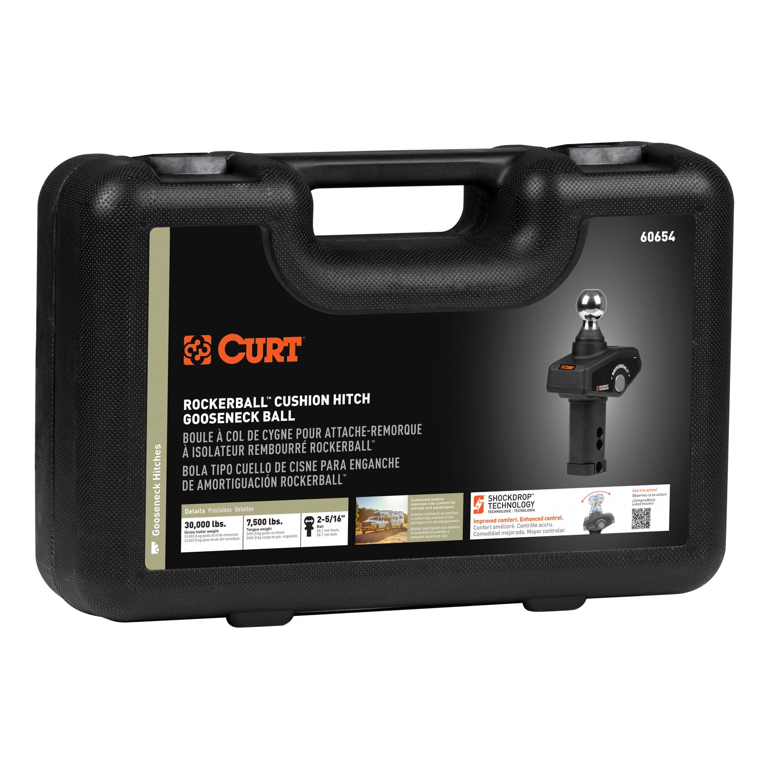 If your gooseneck hitch could use an upgraded ball that improves your ride and minimizes stress on your vehicle, the RockerBall is exactly what you need! The CURT RockerBall cushion hitch gooseneck ball features a cutting-edge structure combined with unique ShockDrop technology to provide a smoother, more comfortable towing experience without having to purchase or replace the entire hitch. RockerBall delivers an effortless upgrade to smoother gooseneck towing. With its simple, drop-in installation technique that eliminates the need to replace the trailer coupler, enhanced towing is just a few steps away by simply dropping the RockerBall into virtually any gooseneck receiver hitch ball hole with no additional adapters needed. Its state-of-the-art construction without airbags or bearings makes it virtually maintenance-free, providing an exceptional gooseneck towing experience that is a step above the rest. The RockerBall gooseneck ball is compatible with CURT Double Lock, Double Lock EZr and B&W Turnoverball hitches, and has a standard 2-5/16 in. diameter ball that couples to most gooseneck trailers. With its integrated ShockDrop technology, RockerBall reduces jerking and jarring, essentially decreasing strain on the vehicle to promote longevity. Its cushioned isolator also improves ride quality by reducing rattling and vibration, providing passengers, animals, and cargo with added comfort to enjoy any journey. Its offset pin buffers vertical chucking and fore-to-aft motion during starts and stops, providing a cushion that leads to an all-around smoother ride. The RockerBall gooseneck ball is rated for up to 30,000 lbs. GTW and 7,500 lbs. vertical load limit, and is constructed with forged steel for dependable towing strength you can rely on. It comes complete with a durable carbide black powder coat finish on the base and chrome plating on the ball, and is tested for safety to meet SAE J2638 specifications to give you confidence for the road ahead in every aspect.