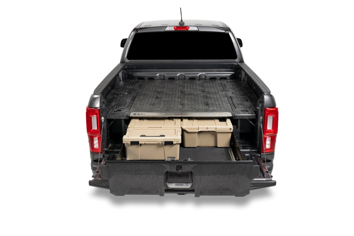The DECKED in-vehicle storage system offers secure, weatherproof and organized storage with a sliding drawer toolbox system for pick up trucks. 100% American made, the DECKED system features two secure, full bed-length drawers capable of carrying 200lb each that glide effortlessly on industrial-grade wheels beneath a 2,000lb payload-rated deck. Constructed from rugged High Density Polyethylene (HDPE) and steel, owners get ergonomic access to tools and equipment while maintaining full use of the truck bed. DECKED systems are perfect for contractors, painters, carpenters, electricians, surveyors, plumbers, handyman services and the outdoor enthusiast who need their truck to have secure storage bins that are easy to access. The drawers slide out at waist height while still allowing the owner full use of their truck bed. The system, once assembled, is easily installed and removed. Accessories are available for customizable storage.