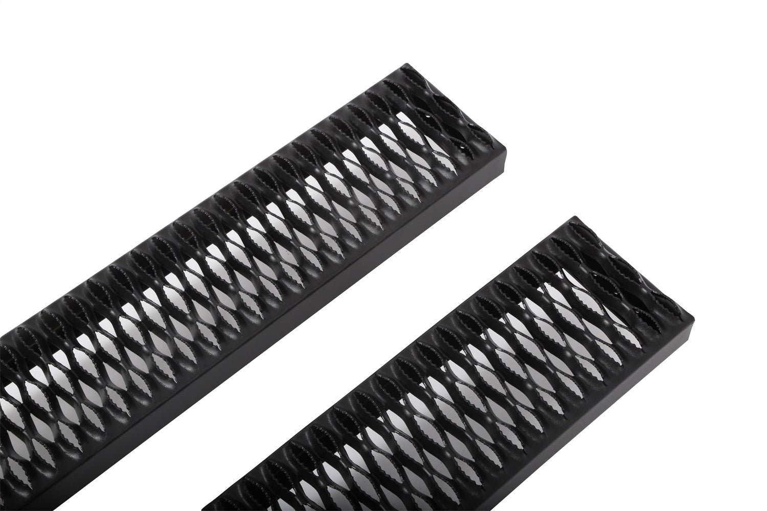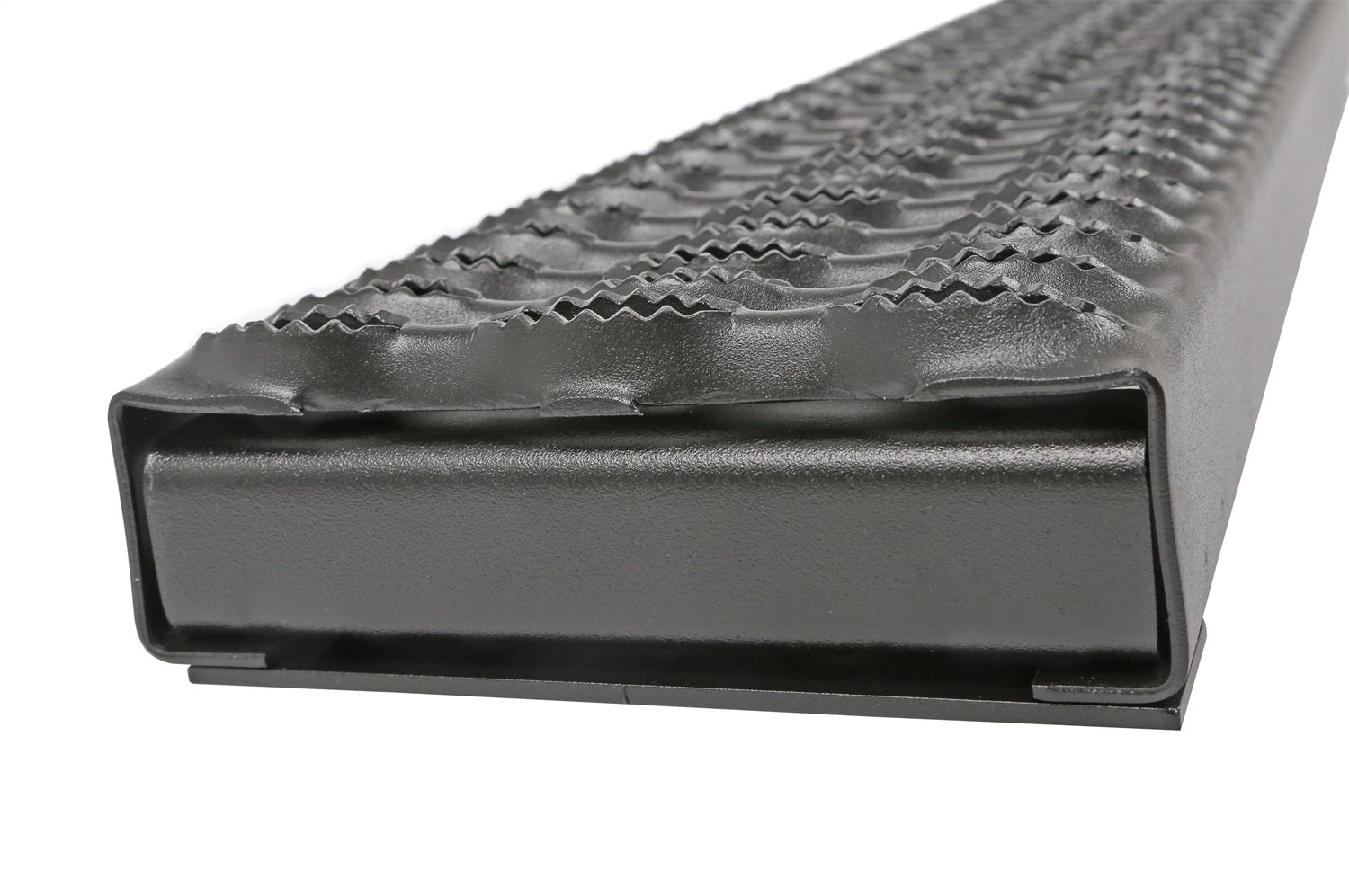 Dee Zee Rough Step - Industrial gauge steel coated in Dee Zee's black NRT(TM) (No Rust Technology) powder coat to increase corrosion resistance. Industrial grating step provides extra traction getting in and out of the vehicle while allowing mud, water, snow, and ice to drain off the stepping area. Full length 90 in. passenger board and front door only on driver side. Custom fit brackets are included to eliminate drilling.