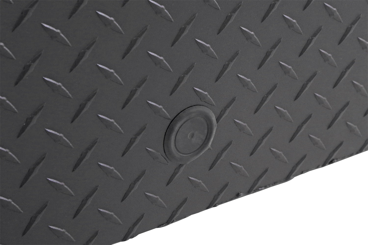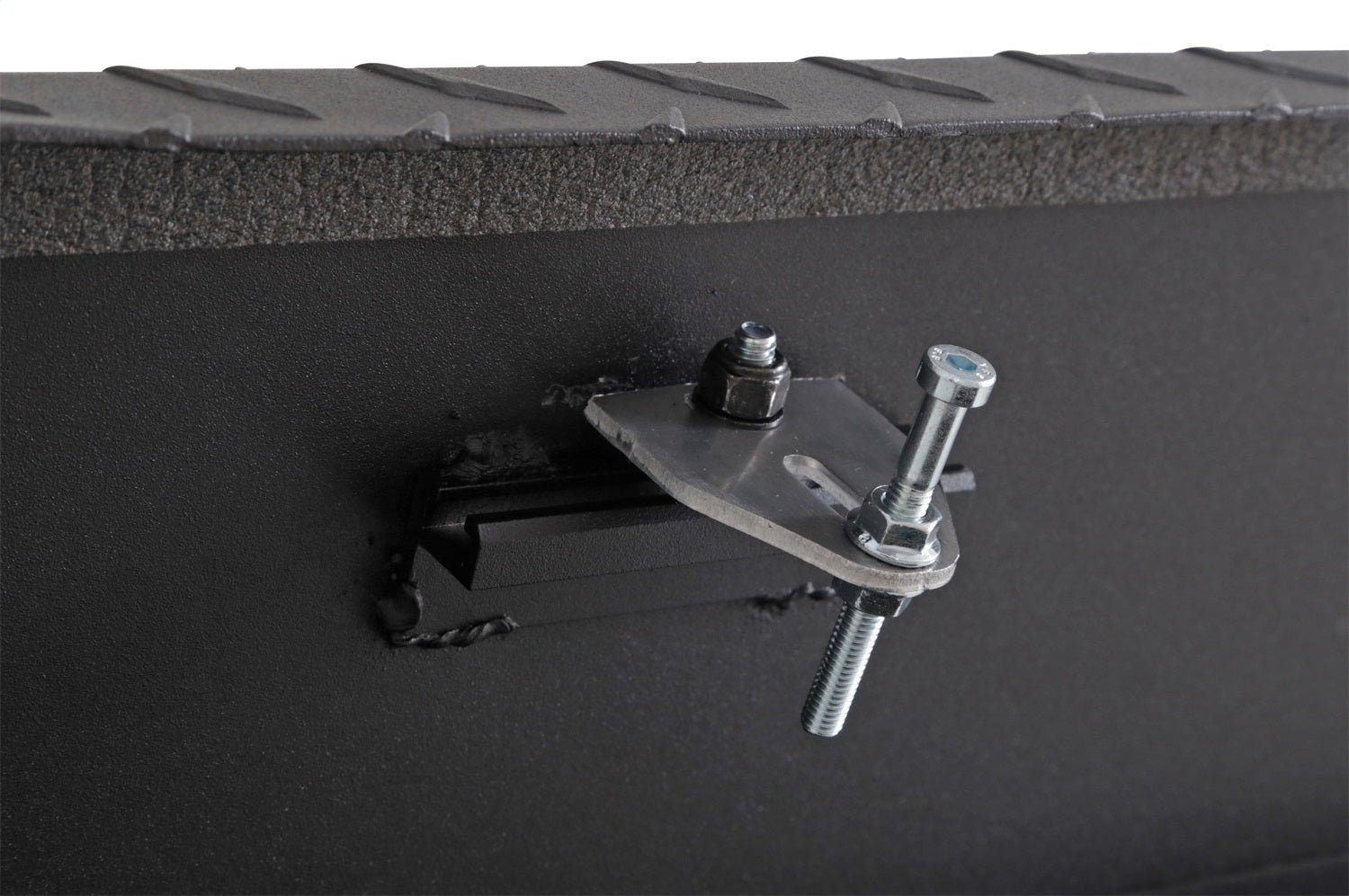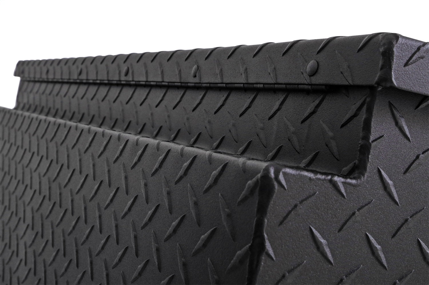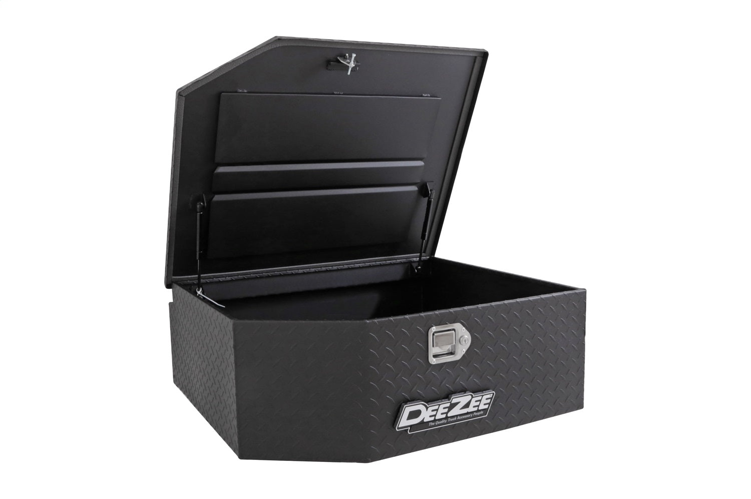 Dee Zee Tool Box -Jeep boxes. Constructed of heavy duty Brite-Tread aluminum. Texture black powder coat, provides a matte black finish while it protects and prevents oxidation. Crown style lid with a full pan double-V stiffener for superior rigidity. Convenient side handles for easy transport. Other features: lockable stainless steel paddle handles, dampened gas shocks, closed cell foam gasket, and self-adjusting strikers. Removable plastic tool tray to help keep small items organized.