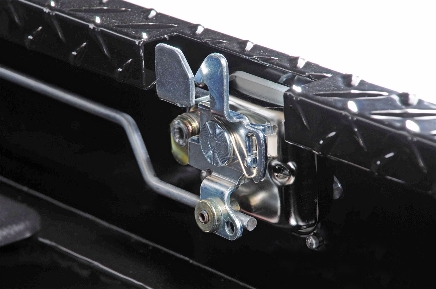 Dee Zee Tool Box - Red Label Single Lid Crossover. Constructed of heavy duty Brite-Tread aluminum. Crown style lid with a full pan double-V stiffener for superior rigidity. Other features: lockable stainless steel pull handles, dampened gas shocks, closed cell foam gasket, and self-adjusting strikers. Removable plastic tool tray to help keep small items organized.