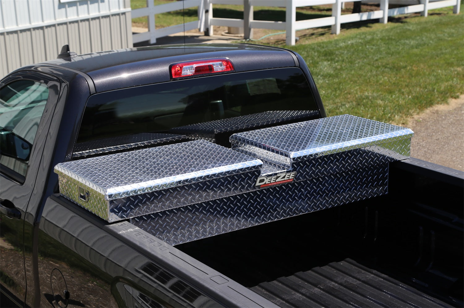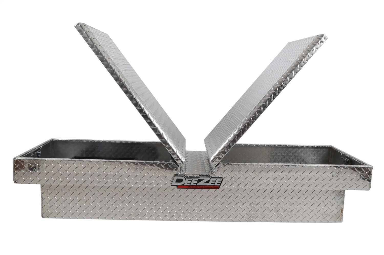 Dee Zee Tool Box - Red Label Double Lid (Gull Wing) Crossover. Constructed of heavy duty Brite-Tread aluminum. Crown style lid for superior rigidity. Other features: lockable stainless steel paddle handles, dampened gas shocks, closed cell foam gasket, and self-adjusting strikers. Removable plastic tool tray to help keep small items organized.
