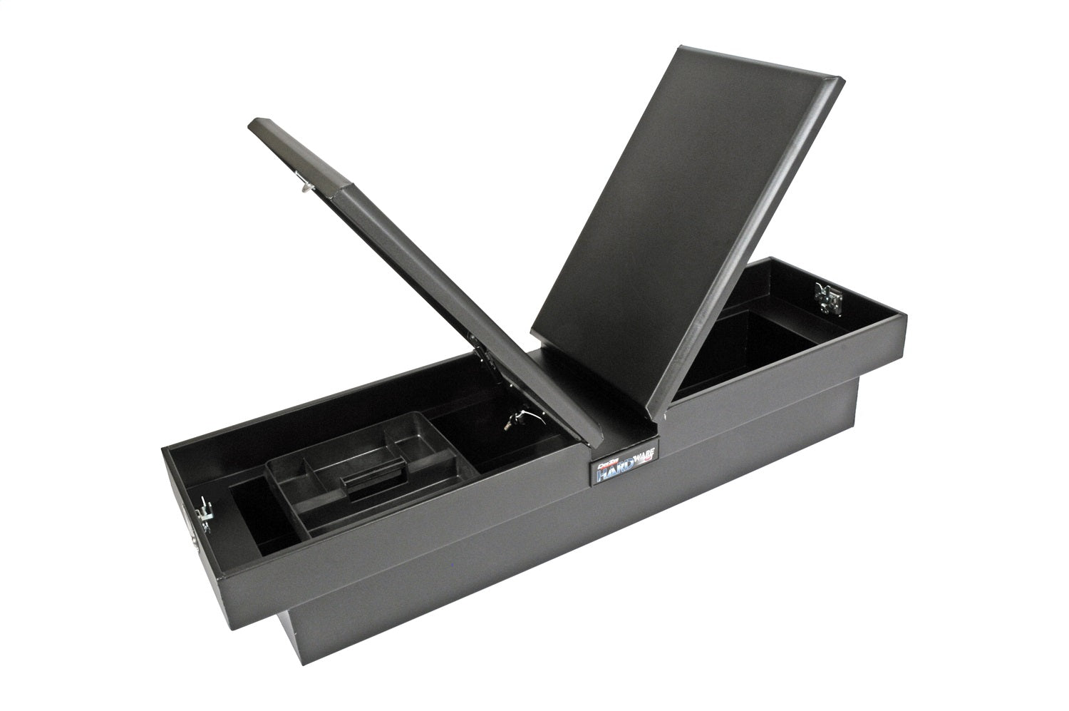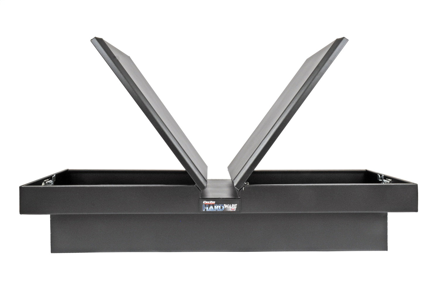 Dee Zee Tool Box - Hardware Series Double Lid (Gull Wing) Crossover. Constructed of durable 20-gauge steel. Protected by texture black NRT(TM) (No Rust Technology) rust inhibitor powder coat finish. Crown style lid with a full pan double-V stiffener for superior rigidity. Other features: lockable stainless steel paddle handles, dampened gas shocks, closed cell foam gasket, and self-adjusting strikers. Removable plastic tool tray to help keep small items organized.