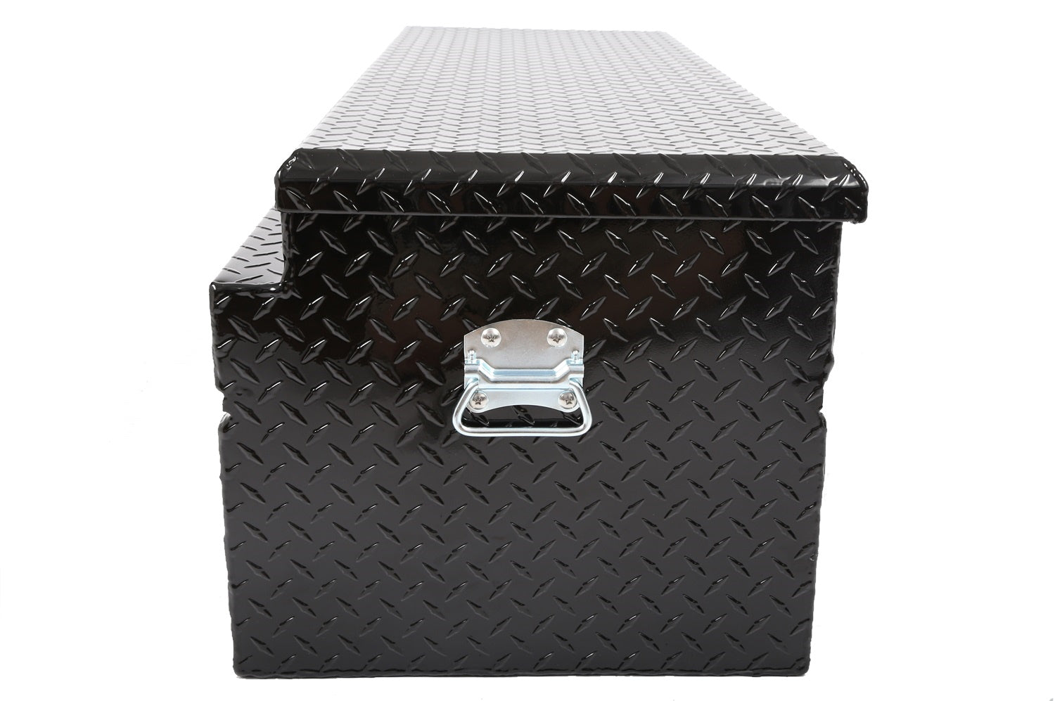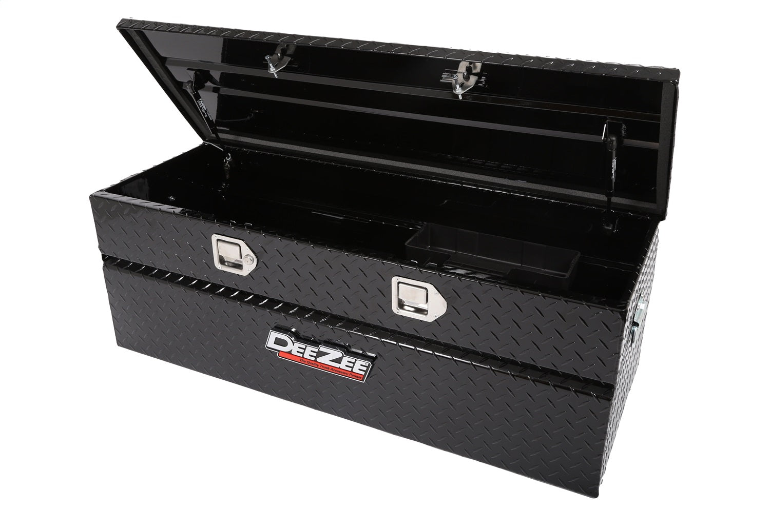 Dee Zee Tool Box - Red Label Chest. Constructed of heavy duty Brite-Tread aluminum. Black-Tread powder coat, provides a gloss black finish while it protects and prevents oxidation. Crown style lid with a full pan double-V stiffener for superior rigidity. Convenient side handles for easy transport. Other features: lockable stainless steel paddle handles, dampened gas shocks, closed cell foam gasket, and self-adjusting strikers. Removable plastic tool tray to help keep small items organized.