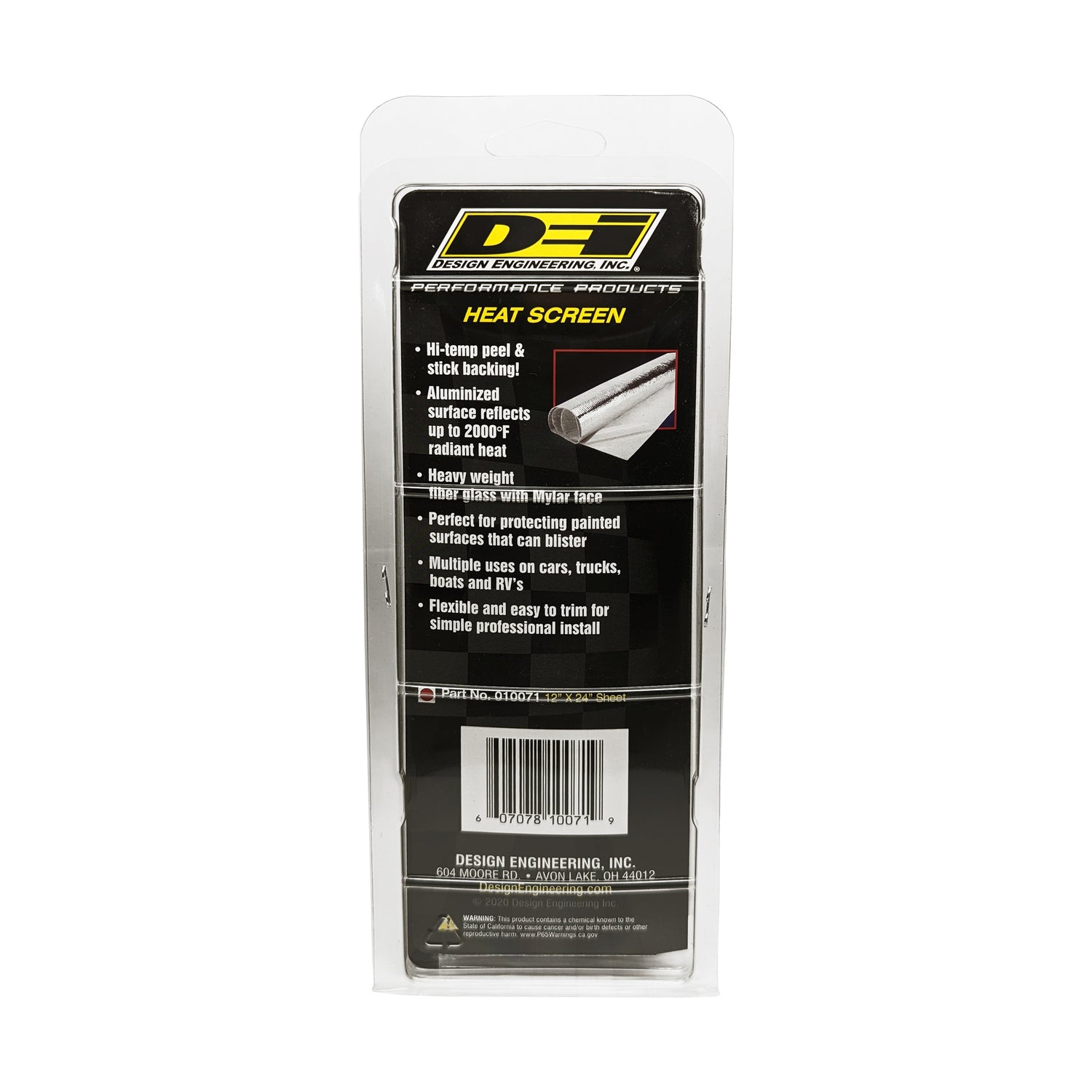 Heat Screen(TM) solves the problem of heat from engines and exhaust intruding into interiors and components. Heat Screen(TM) offers an excellent way to reflect radiant heat away from a vehicle's interior and because it's flexible and can be trimmed-to-size to protect against excessive heat sources. Constructed of a high temperature resistant fiberglass material, and with a thickness of only .060 in., Heat Screen(TM) features a thermal barrier on one side made of a superior reflective aluminized mylar surface, capable of withstanding direct heat up to 1200°F. Heat Screen(TM) can be used to protect areas where excessive heat can blister paint, where exhaust pipes run close to the fuel tank, and has many other applications including floorboards, body panels, and under carpeting. DEI's Cool Tape(TM) is ideal for sealing and covering seams. Excellent protection for painted surfaces Withstands 1200°F of direct heat Can be secured with adhesive or fasteners Trim to desired length *DO NOT apply directly to exhaust components.