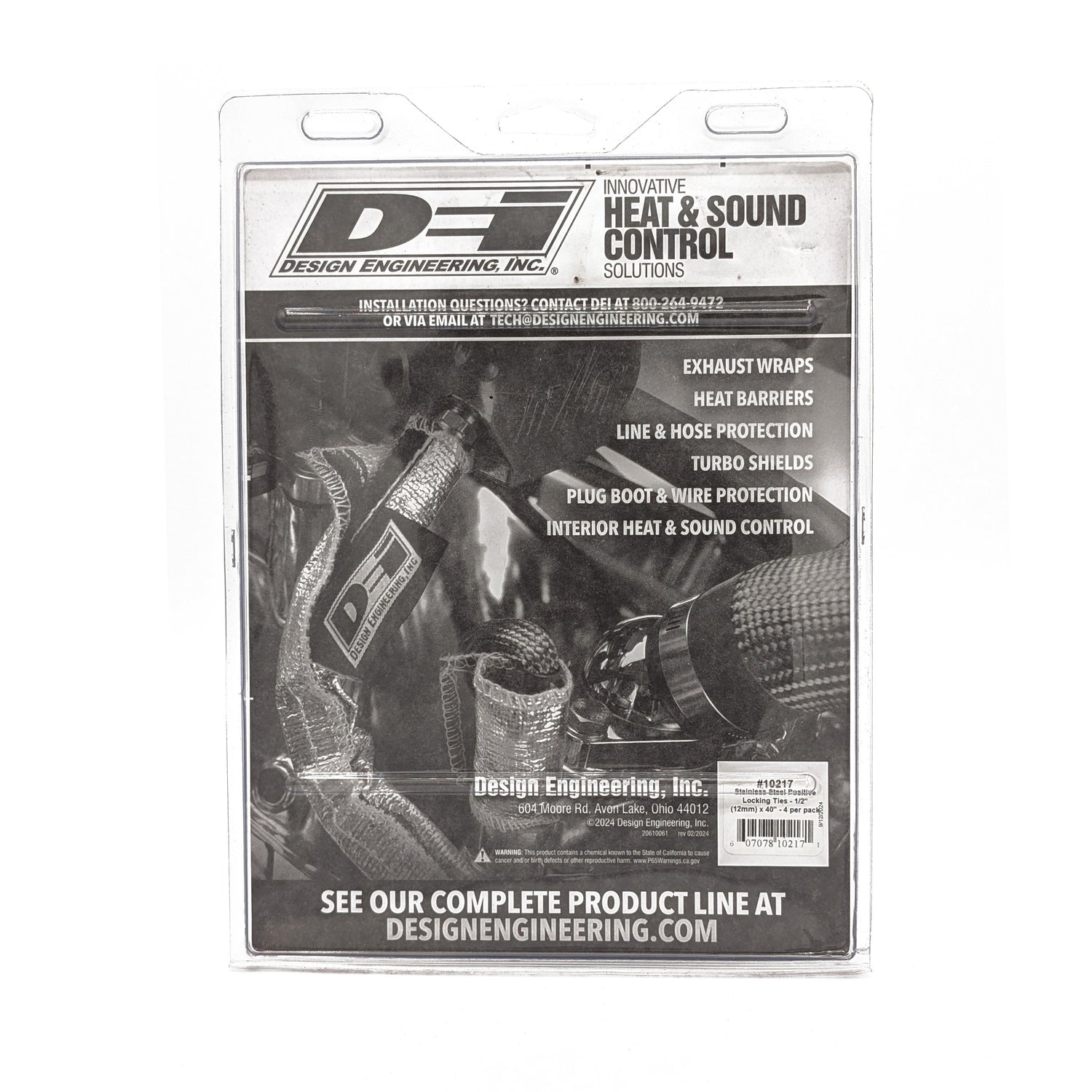 Stainless-Steel Positive Locking Ties secure exhaust wrap and solves the problem of needing a locking tie in high heat areas. Stainless-Steel Positive Locking Ties are designed for high heat applications. With it's self-locking design they are great for securing DEI exhaust wrap to pipes or any place a high strength tie is needed. UV and corrosion resistant they will last for many years under severe use. Locking Ties offer many other uses including bundling wires, hoses, and other forms of insulation products. Just slide end into locking mechanism and pull tight. Made from 316 Stainless Steel Tensile Strength: 5/16 in. 200 lbs., 1/2 in. 350 lbs. Capable of withstanding temperatures in excess of 2500°F Fits up to 12 in. O.D.