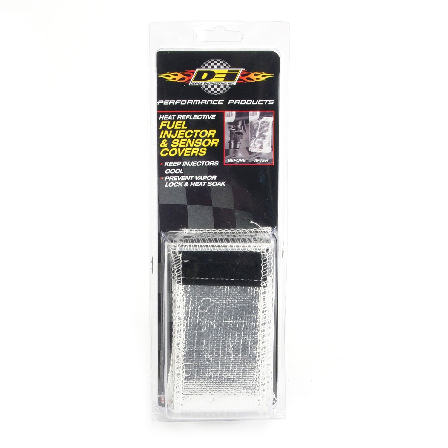 Fuel Injector and sensor covers solve the problem of rough idle, stalling and vapor lock due to hot fuel. In hot temps, both performance and factory fuel injectors can be at risk of vapor lock or heat soak causing a rough idle, slow starting or other potential serious engine problems. DEI has the solution by introducing Fuel Injector Reflective Heat Covers available in packs of two, four, six or eight, that reflect direct and radiant heat away from the injectors. Constructed of high-temperature rated glass fiber material bonded to a heat reflective aluminized material, DEIÂ's Fuel Injector Heat Covers can be used on most any engine configuration utilizing stock or aftermarket fuel injectors. Cooler fuel injectors will perform more efficiently, offering a more consistent throttle response. Installation is a breeze as the injectors do not have to be removed. The covers are made with a split design allowing them to wrap around each individual injector and are secured with a sewn-in hook and loop fastening edge. Universal - fits most fuel injectors & sensors Cooler injectors operate more efficiently Prevent vapor lock & heat soak Easy installation using simple hook and loop fastening 5.25 in. x 2 in.
