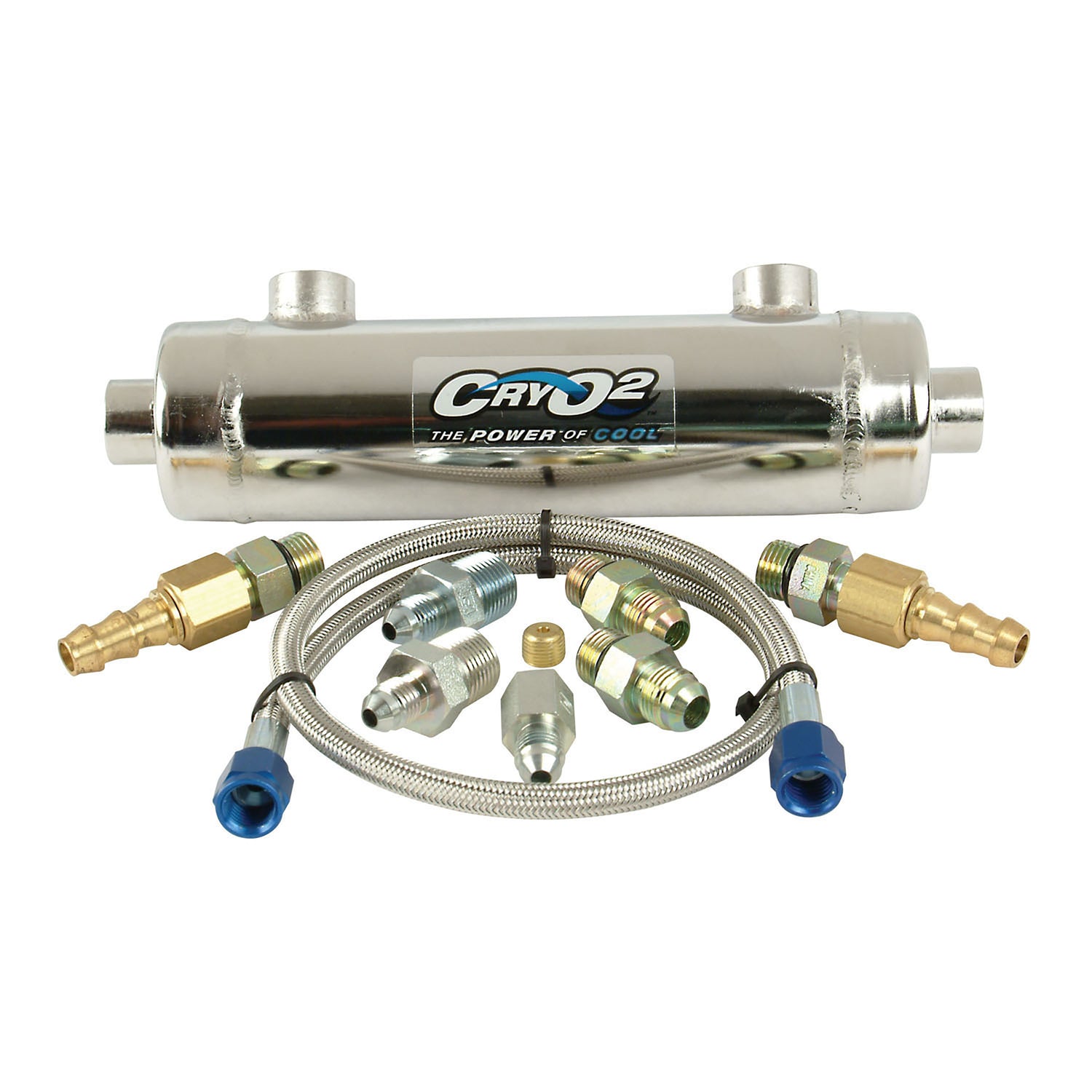 Design Engineerings next generation method of chilling the temperature of fuel before entering the intake stream - the CryO² Fuel Chiller System! The new CryO² Fuel Chiller System uses the cryogenic properties of liquid CO² to charge a series of internal cryogenic chambers surrounding the center fuel line chamber. As the fuel passes through the center chamber the cryogenic-charged chambers super cool the fuel by maximizing the thermal transfer process removing heat four times more effectively than any other system available today. As the temperature of fuel is reduced it increases in density. The denser fuel results in better and more efficient burning of the fuel - consequently generating more power and greater fuel efficiency. Under hood heat created by high pressure fuel pumps, headers exhaust manifolds and other heat generating components all combine to raise the temperature of fuel and creates a potentially lean condition or vapor lock that can damage the engine. The CryO² Fuel Chiller System can be used along with your existing CryO² system, or a nitrous oxide system to lower fuel temperatures and improve HP and efficiency and reduce the chances of engine damage. Each CryO² Fuel Chiller System comes with Two -4AN and -6AN fittings Two 3/8 in. barb fittings Mounting brackets and hardware 2-foot length stainless steel braided hose for use with -4AN fittings Requires a nitrous system or a CryO² Tank and Installation Kit to complete installation