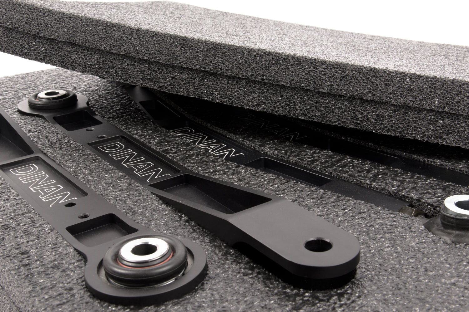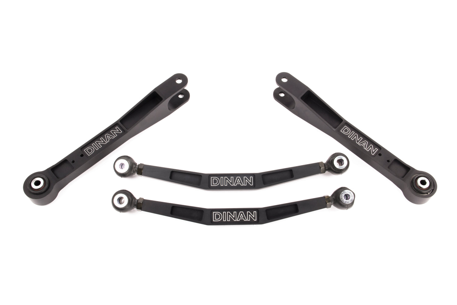 Dinan high performance rear suspension link kit adds precision and predictability at the limit. The stock rear toe link setup is built with rubber bushings and a curved forged alloy rod which can easily flex. During hard acceleration and braking this flex allows the rear wheels to have excessive toe change which ultimately causes the car to be unstable. Dinan stops the flex by replacing the rubber bushings with Teflon(TM) lined machined steel rod ends that significantly reduce pliability while also swapping out the OEM curved bar with a stouter billet aluminum arm, thus adding stability. Like the rear toe links, the stock front trailing links also incorporate rubber bushings. Flex in these bushings allow the rear wheels to behave sloppily under heavy loads. Dinan adds precision by replacing these links with billet aluminum arms and precision ball joints just like the ones f