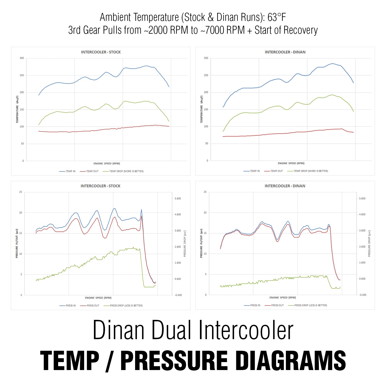 With a bigger turbo and more boost to elicit greater power gains heat becomes larger issue. More heat in turn robs some of the power you just gained. A larger high performance intercooler combats the heat and those power gains are protected. The Dinan dual core intercooler provides a 278% increase in face area along with an equally impressive increase in volume, substantially reducing the pressure drop to 0.8 PSI, as well as providing for more efficient heat exchange and more consistent output power. Dinan unique dual core design allows 2 separate cores to be working in conjunction with one another at all times. This doubling of resources is directly responsible for a 39% improvement in the delta from charge air temperature to ambient temperature. Cool down time is also significantly reduced, enabling the cars to produce full power under varying driving conditions such a
