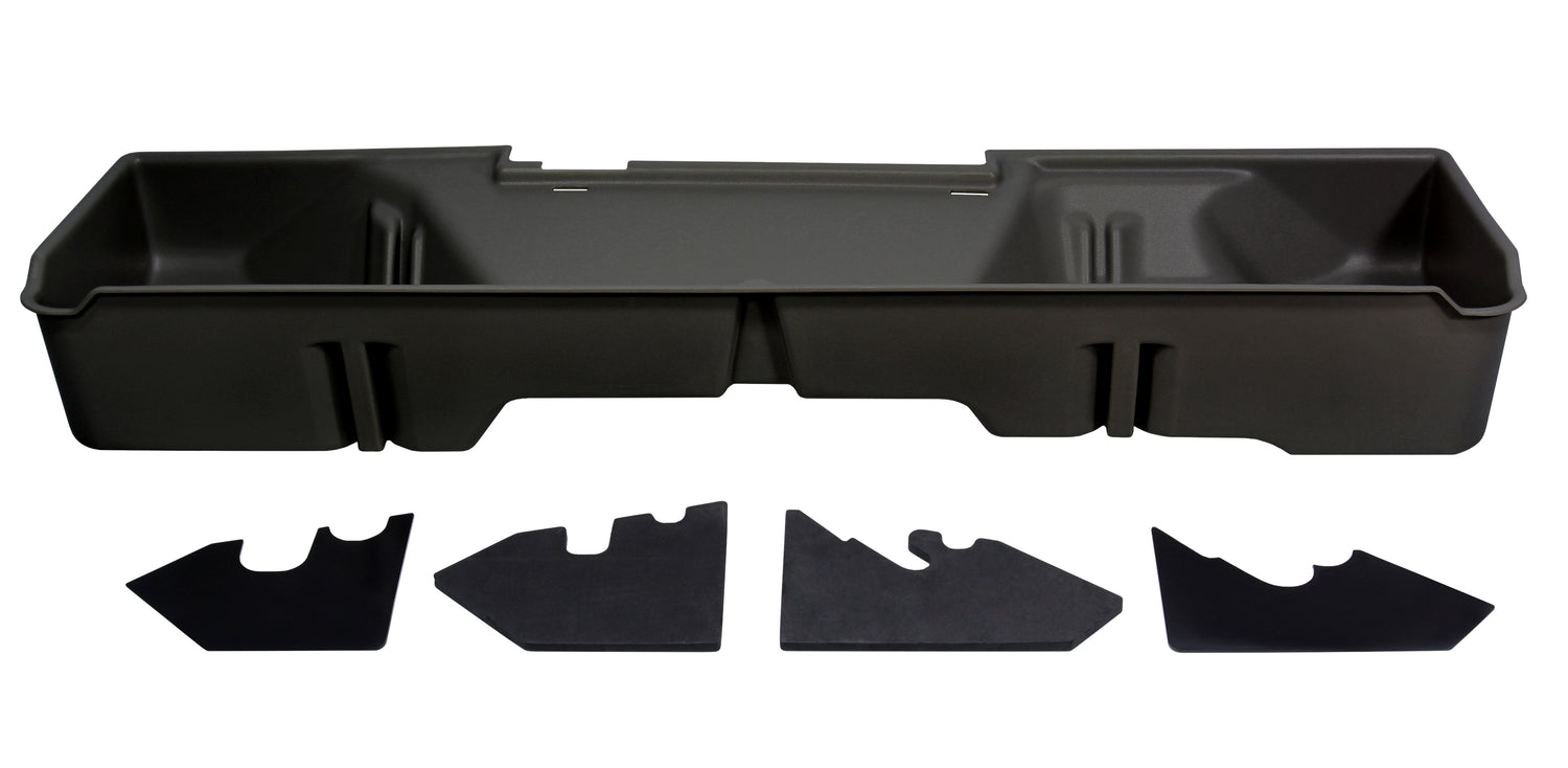 Whether you're a contractor, sports enthusiast, or anyone who values organized and secure storage, the DÜHA Underseat Storage System is the ultimate under seat truck storage solution for seamless truck storage integration. This innovative truck storage system maximizes space, enhances organization, and keeps your guns, tools, and gear safe and secure. Proudly roto-molded and Made in the USA, the DÜHA Underseat Storage System comes with a lifetime warranty, reflecting the manufacturer's confidence in its quality and durability. The DÜHA Underseat Storage System features a durable, heavy-duty roto-molded construction which doesn't allow for flexing and bending. It also includes an easily removable two-piece gun rack/organizer, making it compliant with legal gun case regulations in most states. This allows you to safely store up to two guns, one of which can have a scope. You can also remove the dividers to store larger items. The DÜHA Underseat Storage System seamlessly integrates into your truck's interior, providing a factory-like appearance. It's make/model-specific fit guarantees optimal use of available space without taking up leg room. Elevate the organization and security of your truck's interior with this reliable and purpose-built under seat storage system. Fitment Notes: Minimal tools are required. Instructions are available with purchase or at our resources page. Fits 1/2 ton, 3/4 ton, and 1 ton models. This DÜHA Underseat Storage System is custom designed to fit specific Y/M/M extended cab trucks and will NOT fit Crew Cab models.