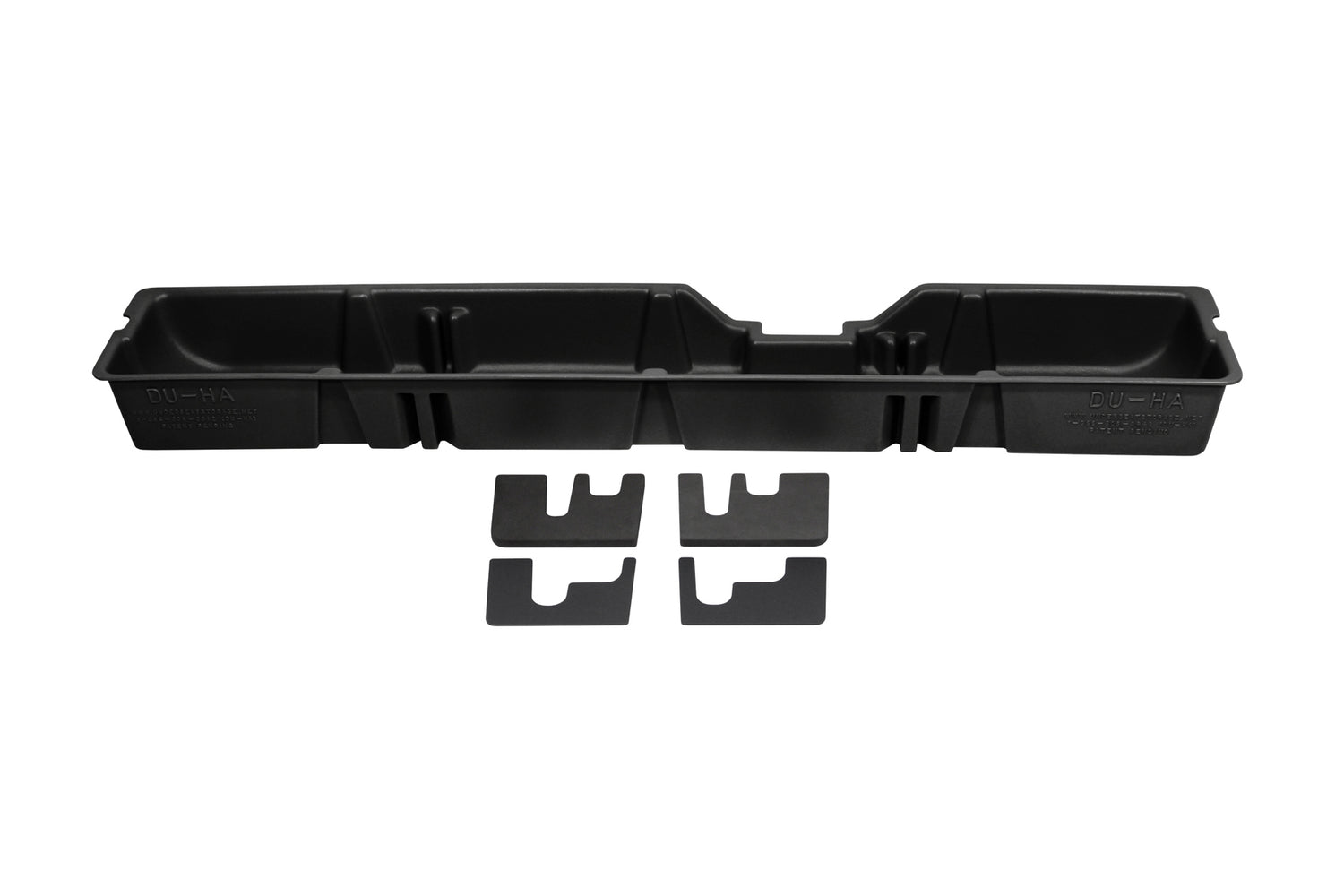 Whether you're a contractor, sports enthusiast, or anyone who values organized and secure storage, the DÜHA Underseat Storage System is the ultimate under seat truck storage solution for seamless truck storage integration. This innovative truck storage system maximizes space, enhances organization, and keeps your guns, tools, and gear safe and secure. Proudly roto-molded and Made in the USA, the DÜHA Underseat Storage System comes with a lifetime warranty, reflecting the manufacturer's confidence in its quality and durability. The DÜHA Underseat Storage System features a durable, heavy-duty roto-molded construction which doesn't allow for flexing and bending. It also includes an easily removable two-piece gun rack/organizer, making it compliant with legal gun case regulations in most states. This allows you to safely store up to two guns without scopes. You can also remove the dividers to store larger items. The DÜHA Underseat Storage System seamlessly integrates into your truck's interior, providing a factory-like appearance. It's make/model-specific fit guarantees optimal use of available space without taking up leg room. Elevate the organization and security of your truck's interior with this reliable and purpose-built under seat storage system. Fitment Notes: Minimal tools are required. Instructions are available with purchase or at our resources page. This model does NOT fit trucks that have the factory subwoofer installed. This DÜHA Underseat Storage System is custom designed to fit specific Y/M/M SuperCab and will not fit SuperCrew trucks.