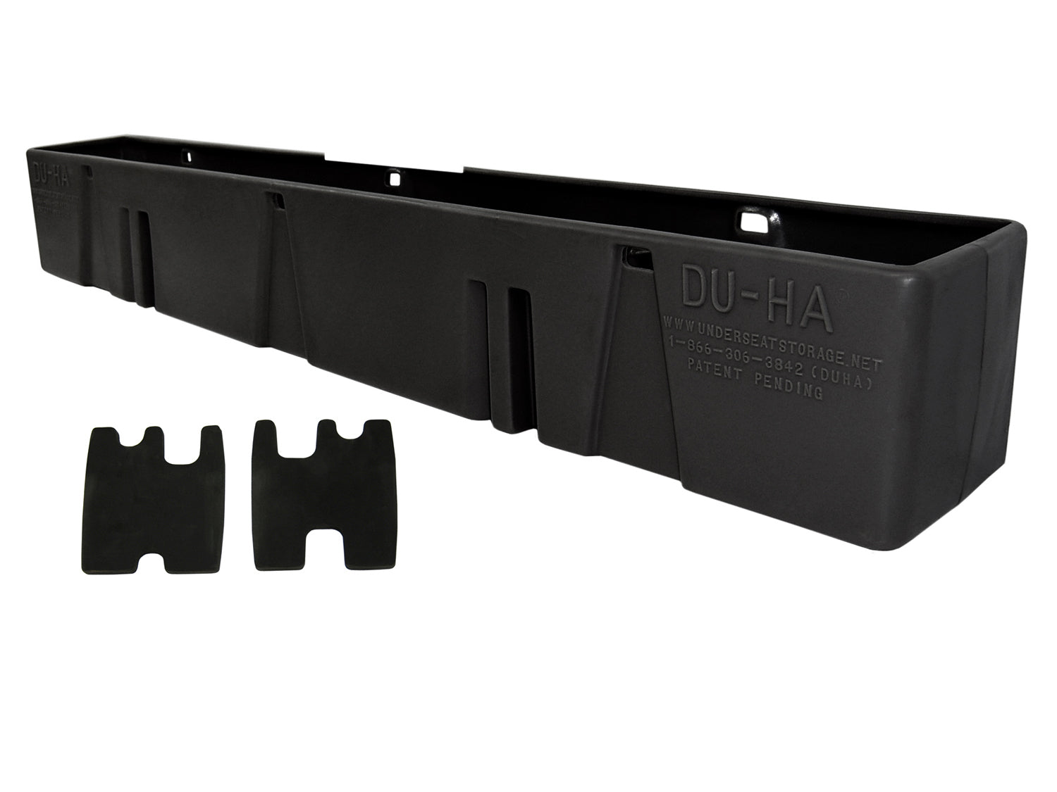Whether you're a contractor, sports enthusiast, or anyone who values organized and secure storage, the DÜHA Behind-the-seat Storage System is the ultimate under seat truck storage solution for seamless truck storage integration. This innovative truck storage system maximizes space, enhances organization, and keeps your guns, tools, and gear safe and secure. Proudly roto-molded and Made in the USA, the DÜHA Behind-the-seat Storage System comes with a lifetime warranty, reflecting the manufacturer's confidence in its quality and durability. The DÜHA Behind-the-seat Storage System features a durable, heavy-duty roto-molded construction which doesn't allow for flexing and bending. It also includes an easily removable two-piece gun rack/organizer, making it compliant with legal gun case regulations in most states. This allows you to safely store up to two guns which both can be equipped with scopes. You can also remove the dividers to store larger items. The DÜHA Behind-the-seat Storage System seamlessly integrates into your truck's interior, providing a factory-like appearance. It's make/model-specific fit guarantees optimal use of available space without taking up leg room. Elevate the organization and security of your truck's interior with this reliable and purpose-built behind-the-seat storage system. Fitment Notes: Some trucks may need to temporarily remove jack. Instructions are available with purchase or at our resources page. Will NOT FIT with a factory subwoofer. This DÜHA Behind-the-seat Storage System is custom designed to fit specific Y/M/M regular and crew cab trucks. For crew cab models with a 60/40 split bench seat, you can install both behind-the-seat and under seat storage (Part #20067).