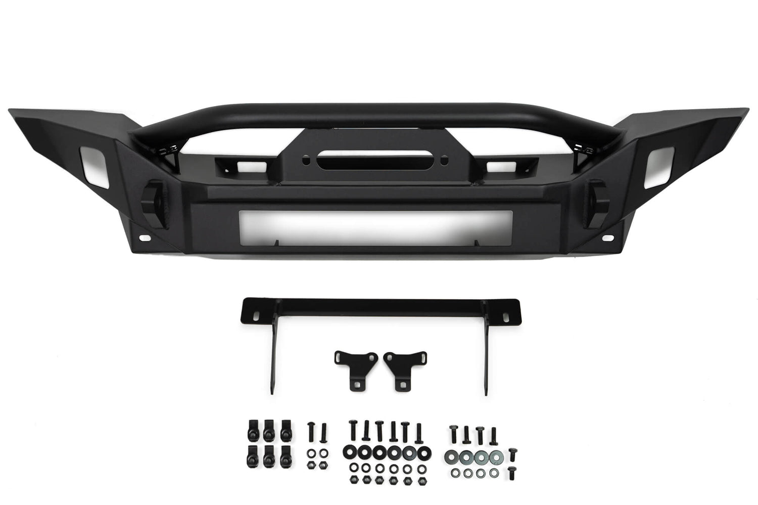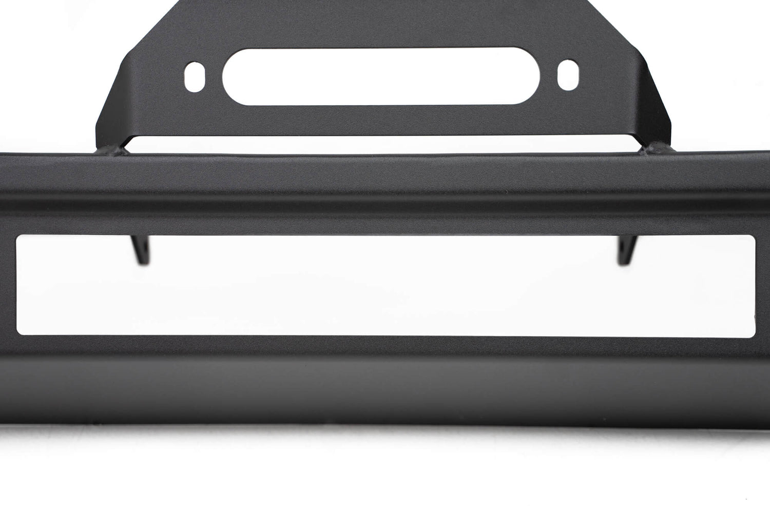 This Mid-Width Winch Front Bumper for the Jeep Wrangler JL & Gladiator JT is a remake of the classic DV8 FS-7 bumper. The winch tray is recessed to keep the winch at a lower profile position, and can accommodate many different sizes of winches. A bull bar sits in front of the winch providing protection. Additional recovery options include D-ring mounts that take ?? shackles. Its high clearance design is perfect for rock crawling. At the center of the bumper is a light mount for a dual row 20-inch light bar. Additionally, each wing can take a 3-inch pod light.