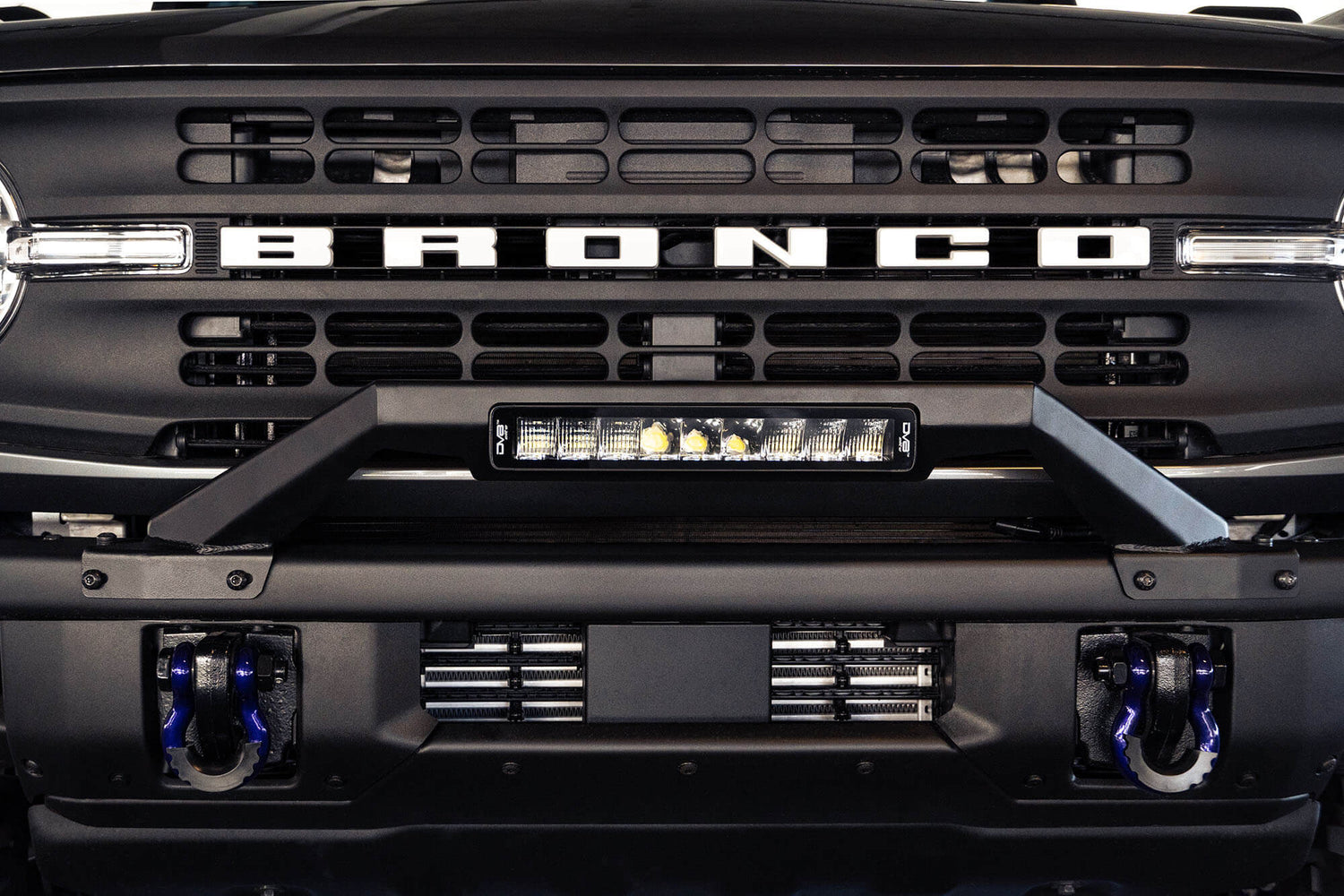 DV8 Offroad has designed a tubular bull bar for the Bronco's factory steel bumper that sits much lower in front of the grille than the OEM version, giving it a low profile appearance. The tube features 2 adjustable light mounts that allow for LED lighting to be mounted above or below the bar. Lighting options include mounting up to a 20- in. light bar above or below the tube, or a pod/round light on each of the 2 tabs.