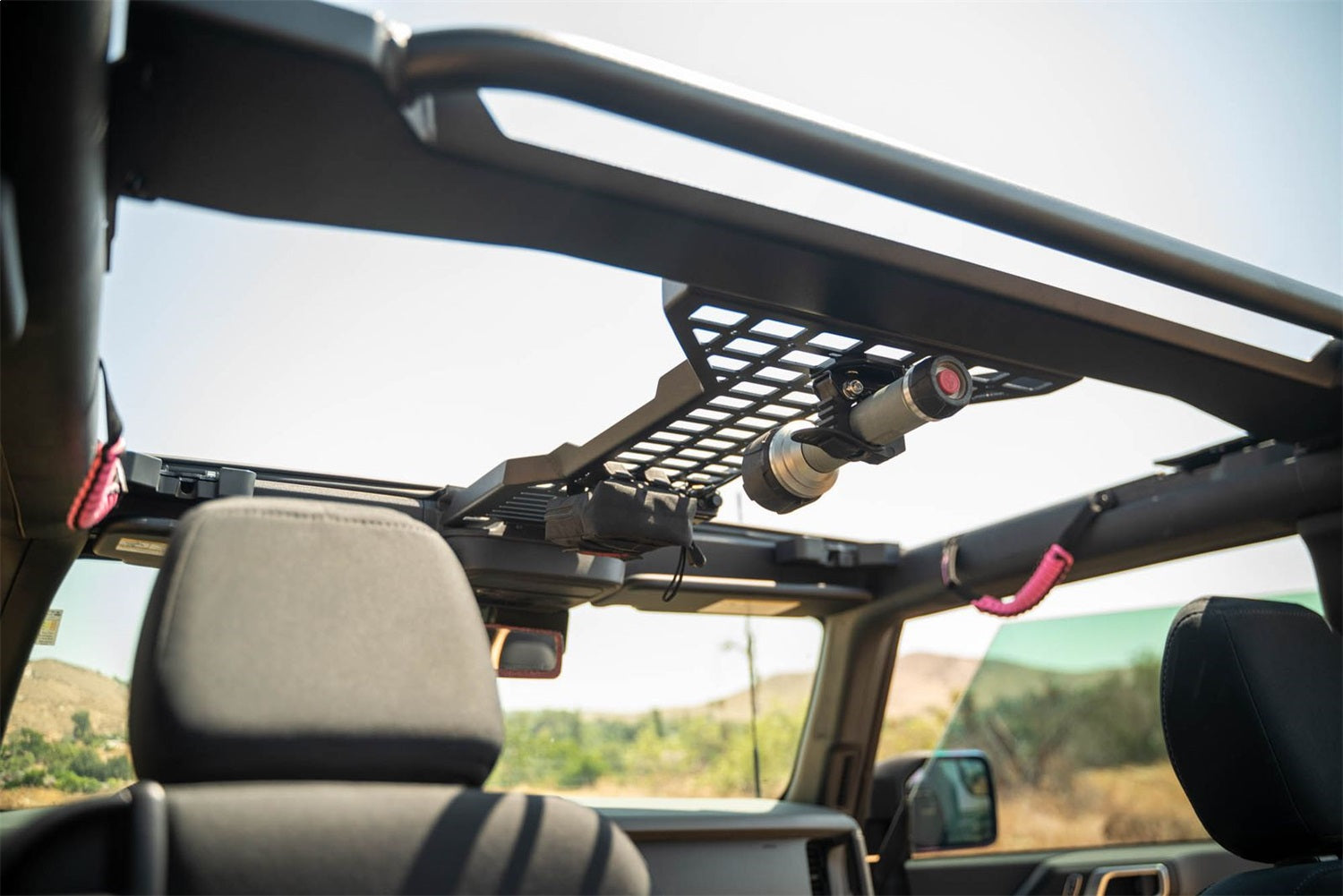 Our Overhead Molle Panel provides extensive mounting and storage capabilities without compromising your limited interior space. You can attach a med-kit, holster, knife sheath, CB or race radio, phone mount, multi-tools, and more for quick access to your daily gear. Blankets, bags, and other smaller items can be strapped down to the top of the panels for additional storage. The 1 1/4-inch steel tube located at the rear of the molle panel can be utilized as an additional mounting point for accessories or as a grab handle for your back seat passengers when taking them out on the trail. The panel features an integrated mount for one Baja Designs Dome Light for illuminating your cabin. Installation is a breeze thanks to the panel's fully bolt-on design with no cutting required. It attaches to multiple factory mounting points for a strong and rigid fit that won't budge or rattle. The molle panel is made from durable steel and finished in a micro-texture black powder coat for a sleek look that compliments your Bronco's interior and exterior styling. * Please Note: This panel is only compatible with 2-door models. For 4-door Broncos, check out our Standard Overhead Molle Panel.