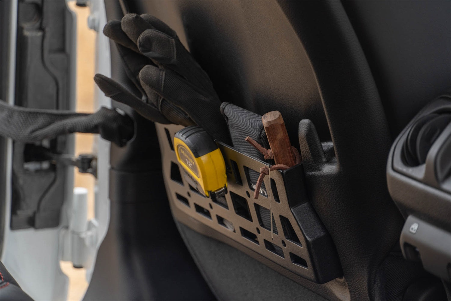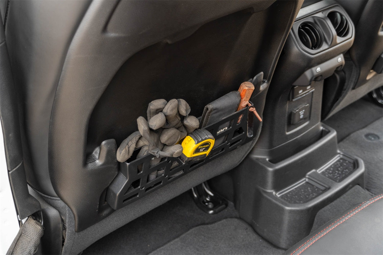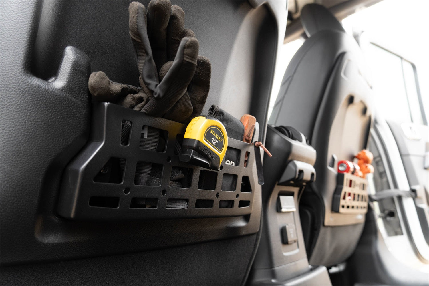 Our Seat Back Molle Pockets replace the weak factory netting with rigid steel panels for improved storage capabilities. The molle design provides mounting points for pouches, med kits, multi-tools, knife sheaths, radios, and other off-road or daily gear. When venturing on rough terrain, they offer the perfect spot for your backseat passengers to secure their valuables and prevent them from jostling around inside your vehicle. The pockets are finished in a micro-texture black powder coat that matches the interior styling of your rig for a sleek design. They slide into place at the back of the front seats and are secured with screws for a quick and easy install process. Whether you need the additional space for off-road gear or daily supplies, these seat back molle pockets are the perfect solution. * Please Note: These pockets are only compatible with vinyl seats that are equipped with the factory molle seat backs. ** Please Note: Cutting and removal of the factory netting is required for installation.