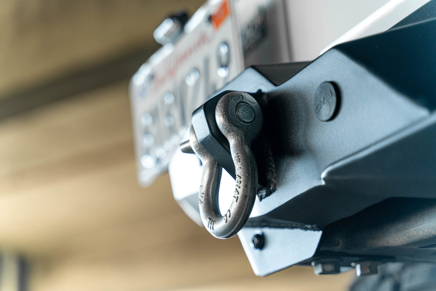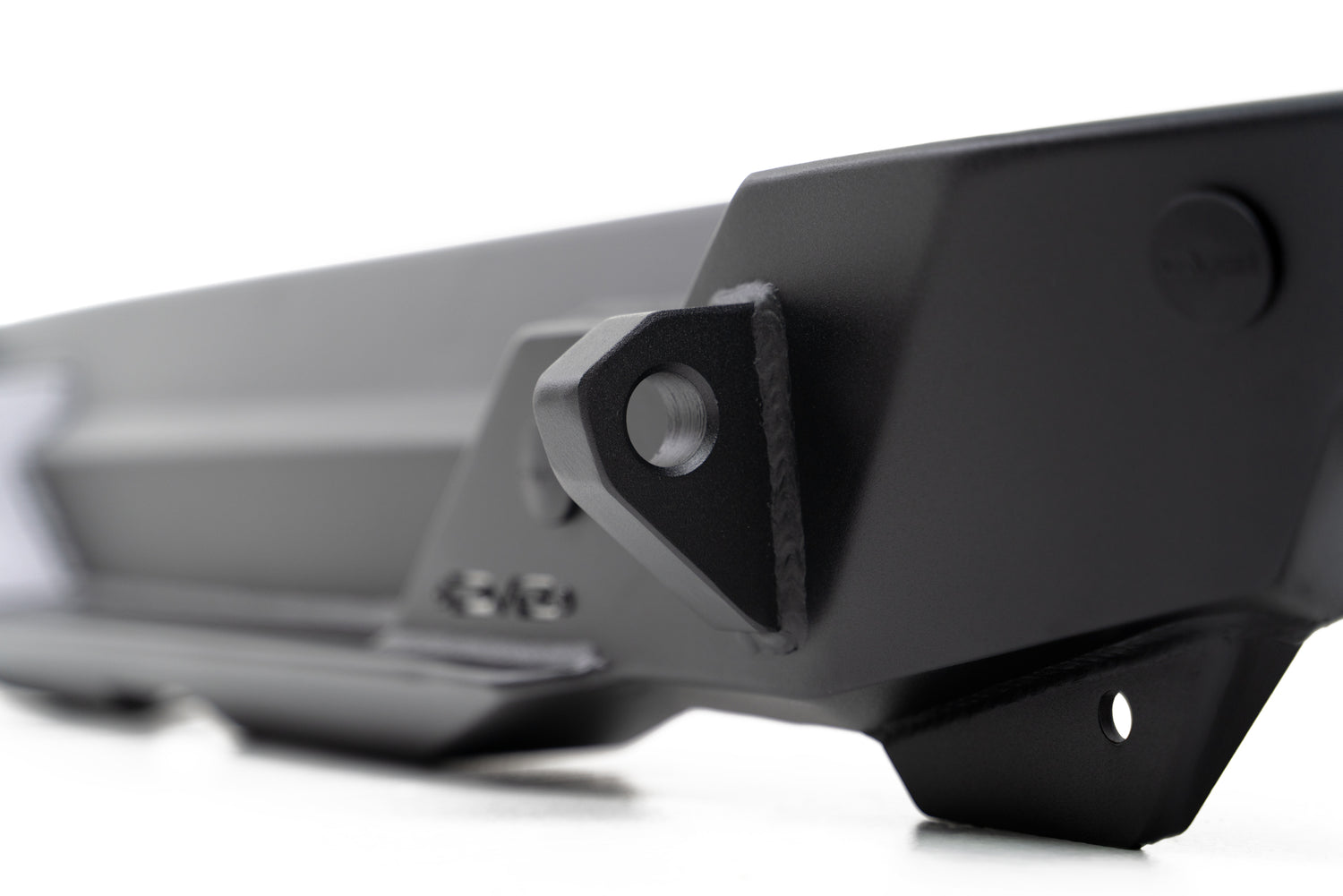 Our FS-15 Rear Bumper features a low profile design suited for aggressive rock crawling. The bumper includes a license plate relocation bracket with a license plate light. The factory hitch and harness fit perfectly in an accessible position beneath the FS-15. For models equipped with factory sensors, we included sensor cutouts to retain full functionality of the feature. For models without factory sensors, we include sensor hole plugs for a clean look. Up to a 37-inch spare tire will fit on the OEM carrier above the bumper. Toward each side of the bumper are 1-inch thick mounts that take ¾-inch D-Rings with ?-inch shackle pins. The inside of the bumper includes welded zip-tie tabs for clean wire management of the license plate light or other optional accessories. Finished in a micro-texture black powder coat, the FS-15 features a fully bolt-on installation.