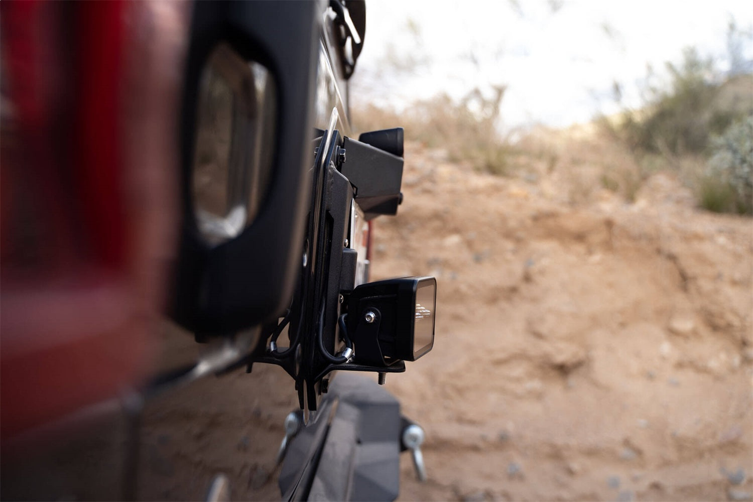 The DV8 Jeep JL Spare Tire delete not only covers the hole left by removing your spare tire mount, but also features a license plate mount with included plate lights. On each side of the delete, a pod light can be mounted to provide supplemental lighting when off-road.