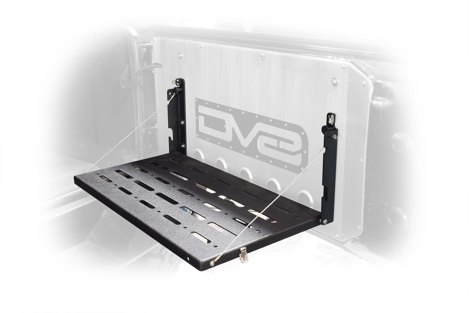 DV8 Offroad Jeep JK Folding Trail Table. Constructed from solid steel and powdercoated for protection the DV8 TTJK-01 is a convenient table that folds down from the tailgate. Whether you are doing a trail repair or just making lunch, this table just makes life easier.