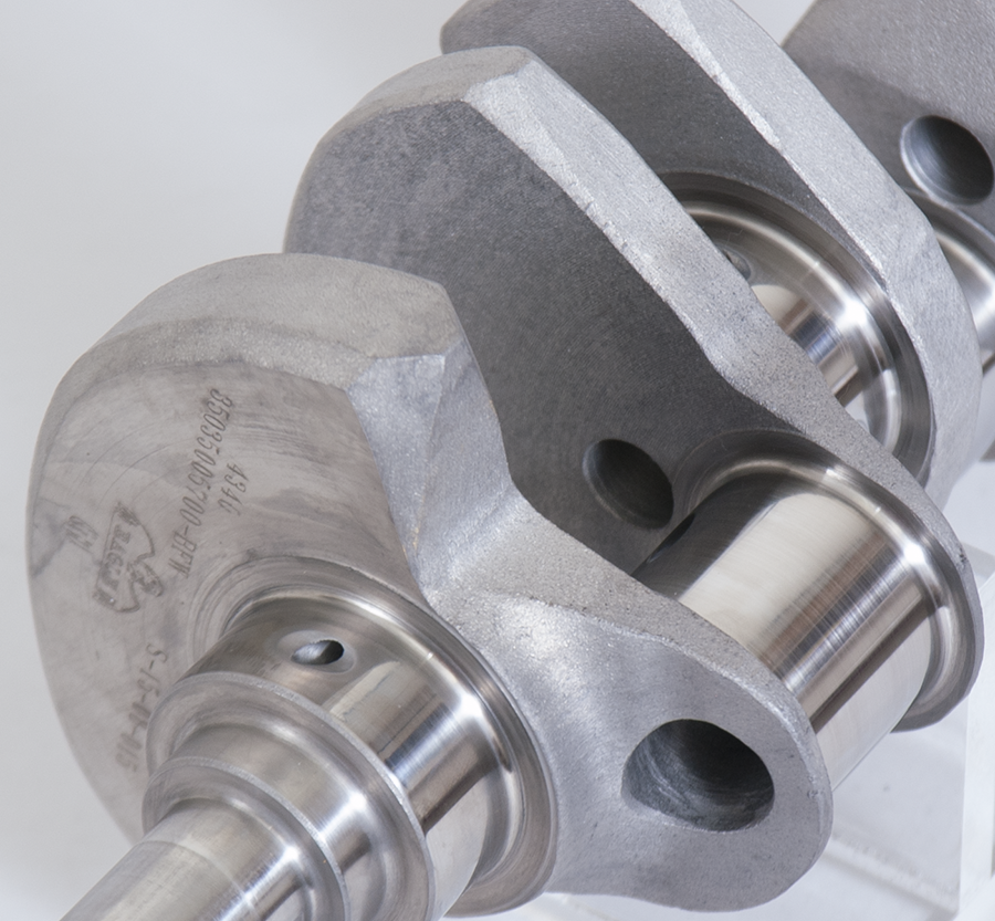 Eagle featherweight forged 4340 steel Cranks feature a non-twist forging, lightweight counterweight design to reduce rotating weight, .125" fillet radiuses for superior strength so chamfered / narrowed bearings required, nitrided surface and micropolished. Intended for restricted-class competition use. Lightweight rods and pistons required for ease in balancing.