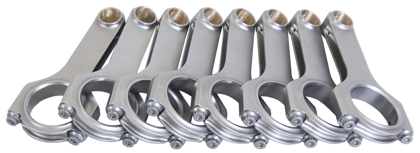 Forged 4340 steel H-Beam connecting rods are forged from a two-piece forging and feature a fully machined and shot-peened surface. Sizing is held to exact tolerances. Sold as a weight-matched set. Recommended for competition use.