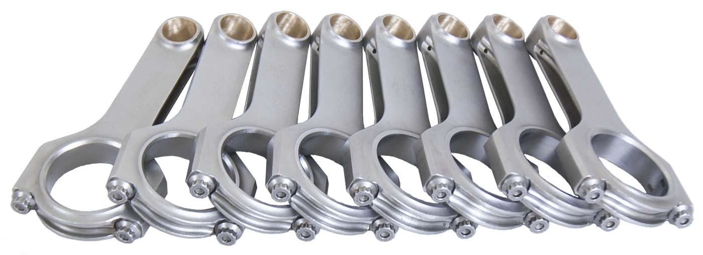 Forged 4340 steel H-Beam connecting rods are forged from a two-piece forging and feature a fully machined and shot-peened surface. Sizing is held to exact tolerances. Sold as a weight-matched set. Equipped with ARP 2000 bolts for even more power-handling capability. Recommended for competition use.