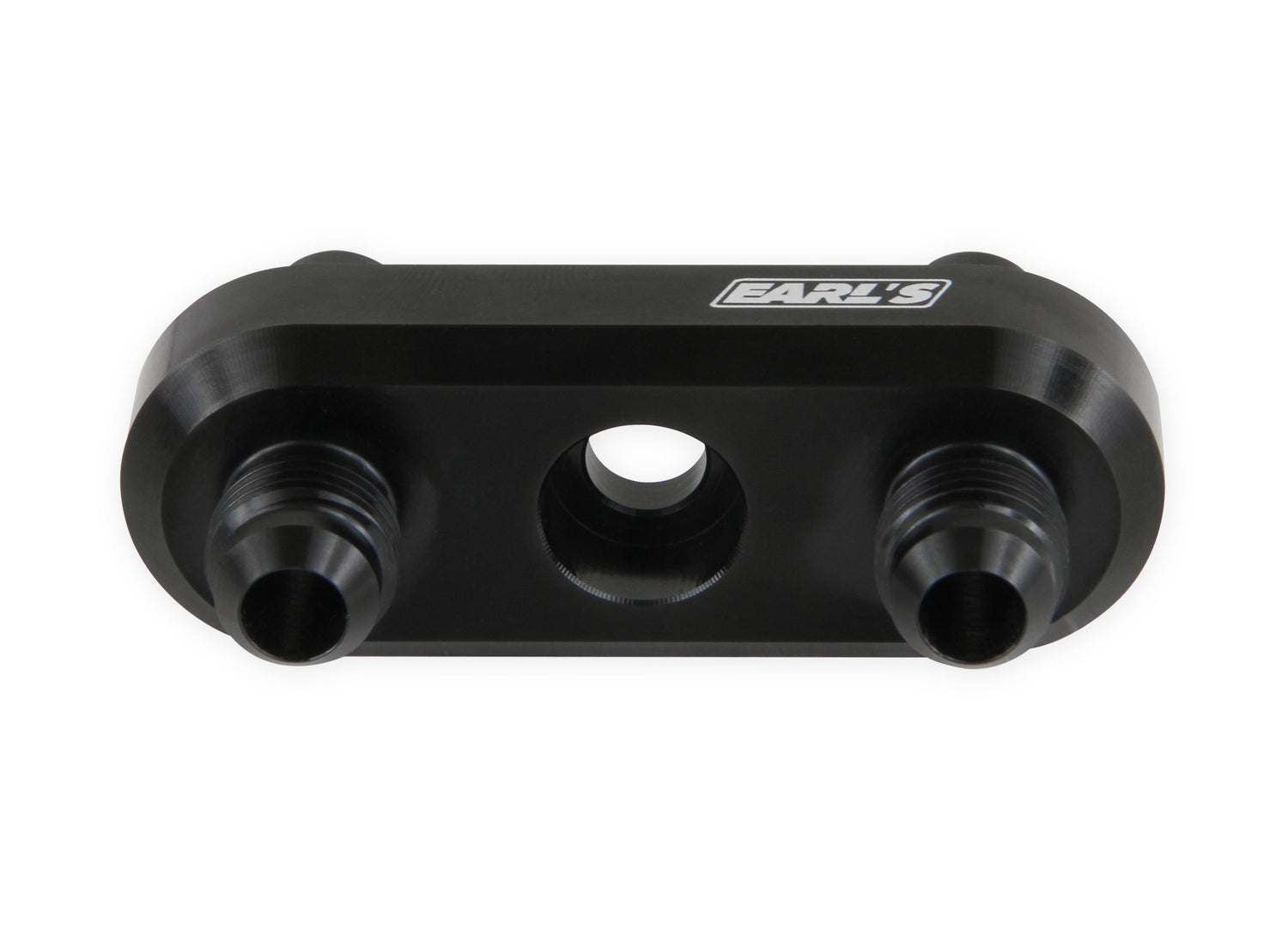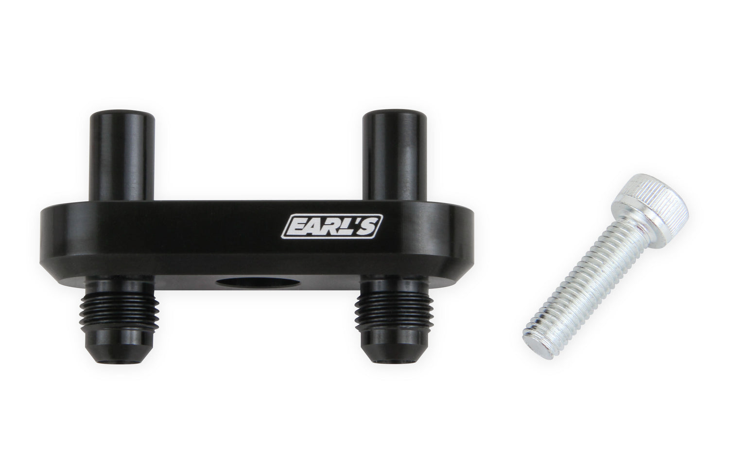 Earl's Transmission oil cooler adapter allows easy installation of AN -6 hoses & oil cooler on late model GM 6 & 8-speed automatic transmissions (fits 6L80E, 6L90E, and 8L90E transmissions). This adapter replaces the factory thermostat. These adapters use O-Ring seals and have -6 AN male flares for use with AN pluming & Earl's oil coolers. Black Anodized finish.