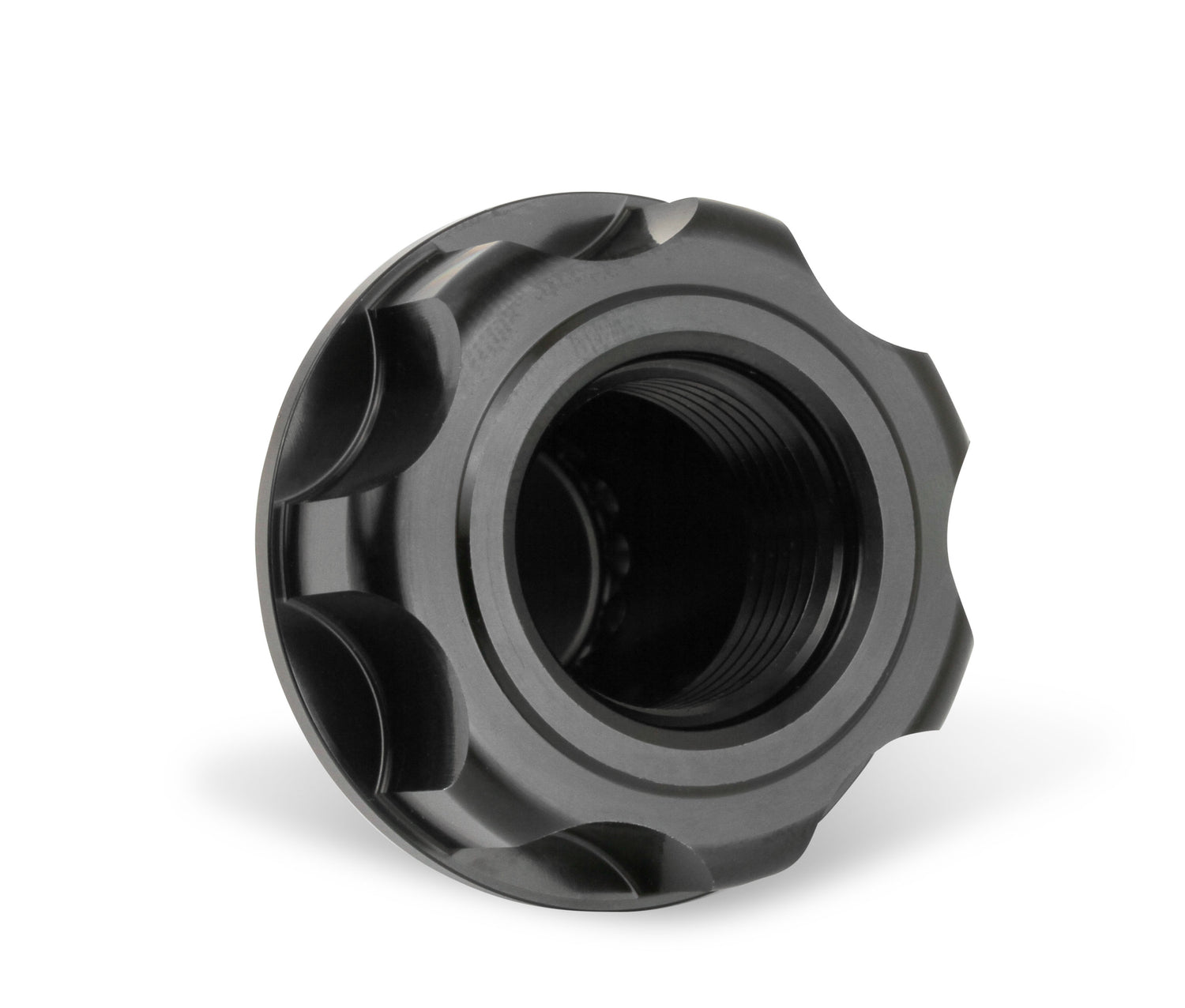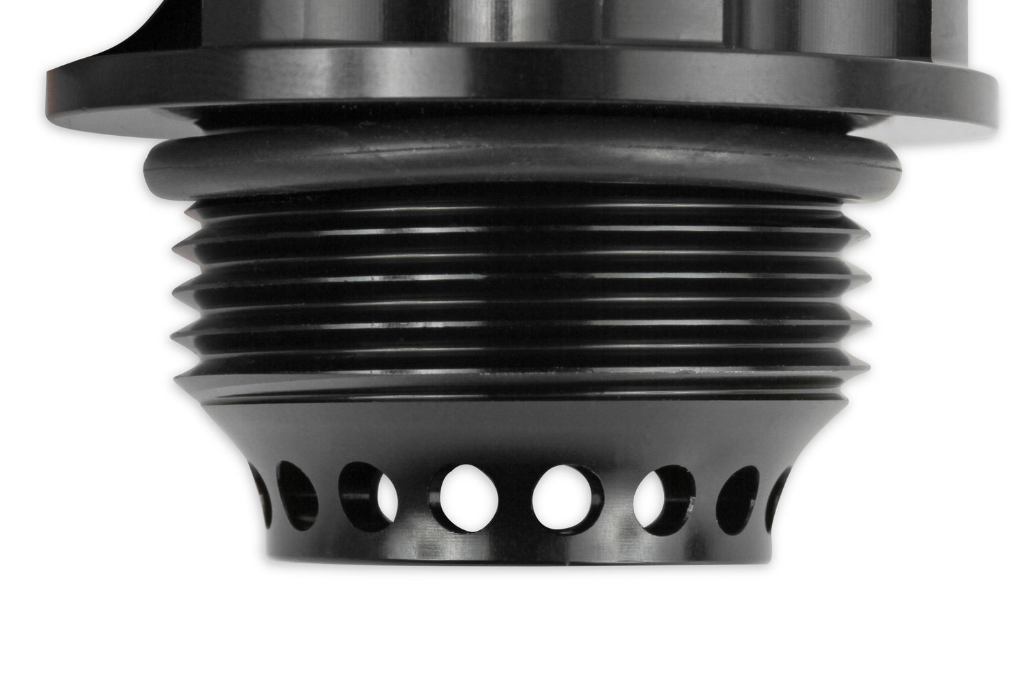 These late model valve cover fill caps screw into the valve cover like an ordinary cap. These caps feature a baffle & -10 ORB (7/8"-14 Straight Thread O-Ring Style Port) for use w/ AN O-Ring Fitting (or Port hose end) & AN hose to the catch tank or PCV. These caps eliminate the need to modify your valve covers when adding a catch tank to your racing engine (required by most sanctioning bodies in racing applications). Choose from two versions w/ one that fits factory valve covers (GM LS, GM Gen-V LT, & Ford Coyote), and the second version that fits Holley Cast Aluminum GM LS Valve Covers. Billet aluminum construction w/ black anodized finish. Use w/ ORB (O-Ring Port) hose end AT849010ERL, or O-ring Port to AN Flare Adapter AT985010ERL (straight), or AT949010ERL (90 Degree) & AN hose to the Catch Tank.