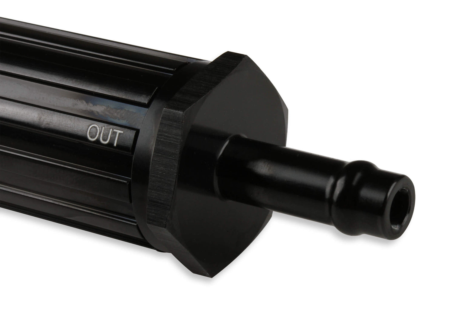 Billet aluminum pre-filter (100 micron) for use before the fuel pump in EFI & carburetor applications. Use w/ Vapor Guard® fuel hose & clamps.