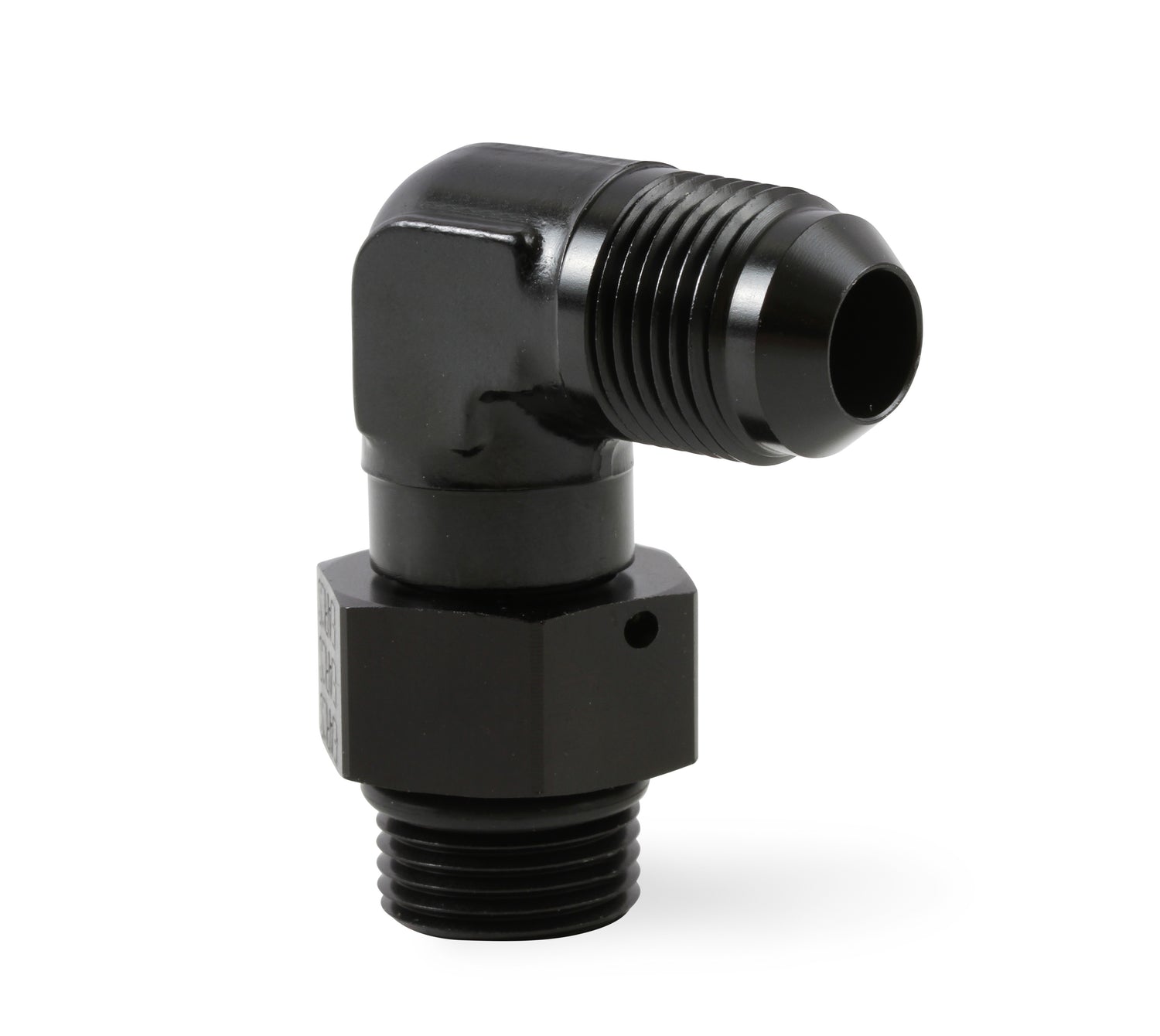 90 Deg. Aluminum AN to O-Ring Port Swivel Adapter; Size: -8AN Male to 3/4-16 in. O-Ring Port Swivel; Anodized Black; Bagged Packaging;