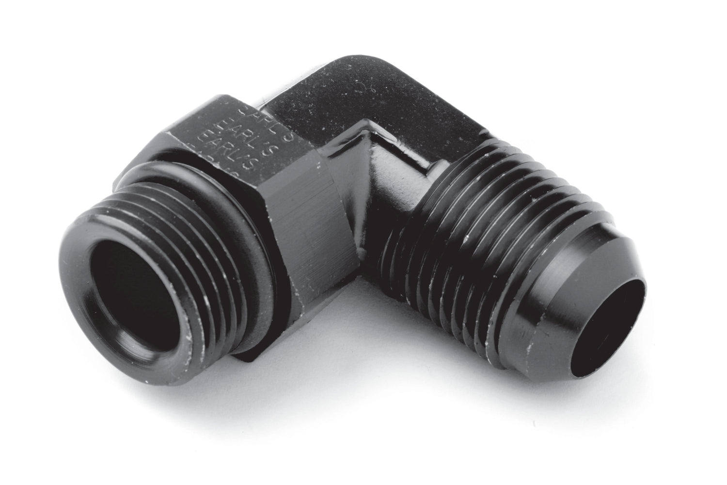 90 Deg. Aluminum AN to O-Ring Port Swivel Adapter; Size: -8AN Male to 7/8-14 in. O-Ring Port Swivel; Anodized Black; Bagged Packaging;