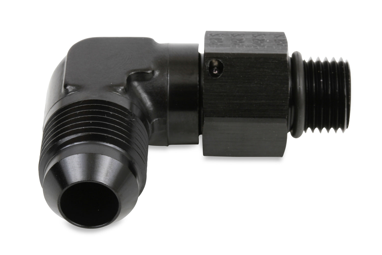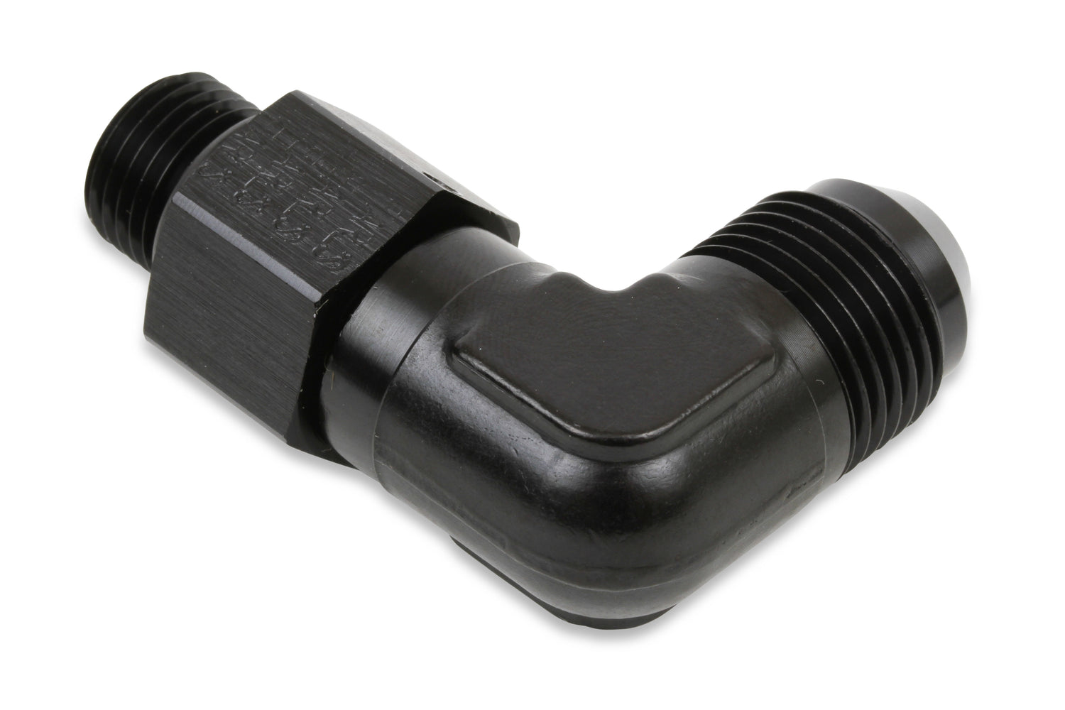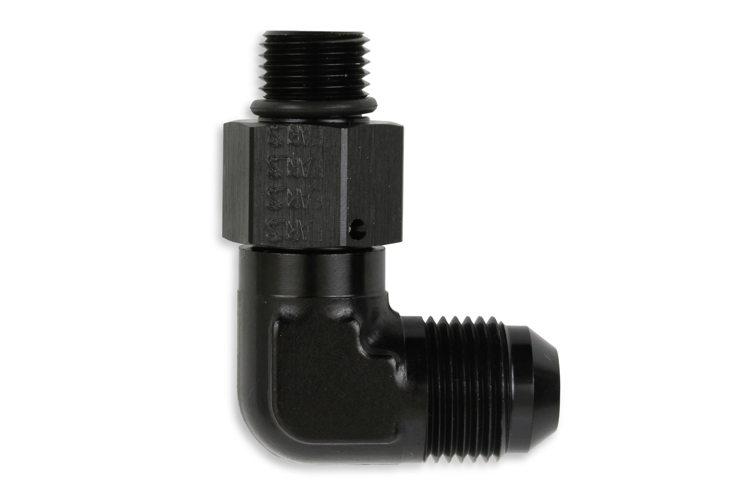 90 Deg. Aluminum AN to O-Ring Port Swivel Adapter; Size: -8AN Male to 9/16-18 in. O-Ring Port Swivel; Anodized Black; Bagged Packaging;