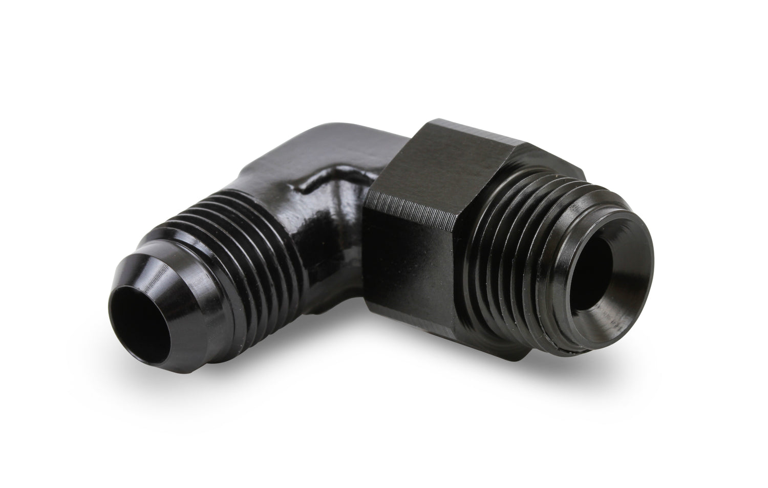 90 Deg. Aluminum AN to O-Ring Port Swivel Adapter; Size: -6AN Male to 5/8-18 in. Swivel; Anodized Black; Bagged Packaging;
