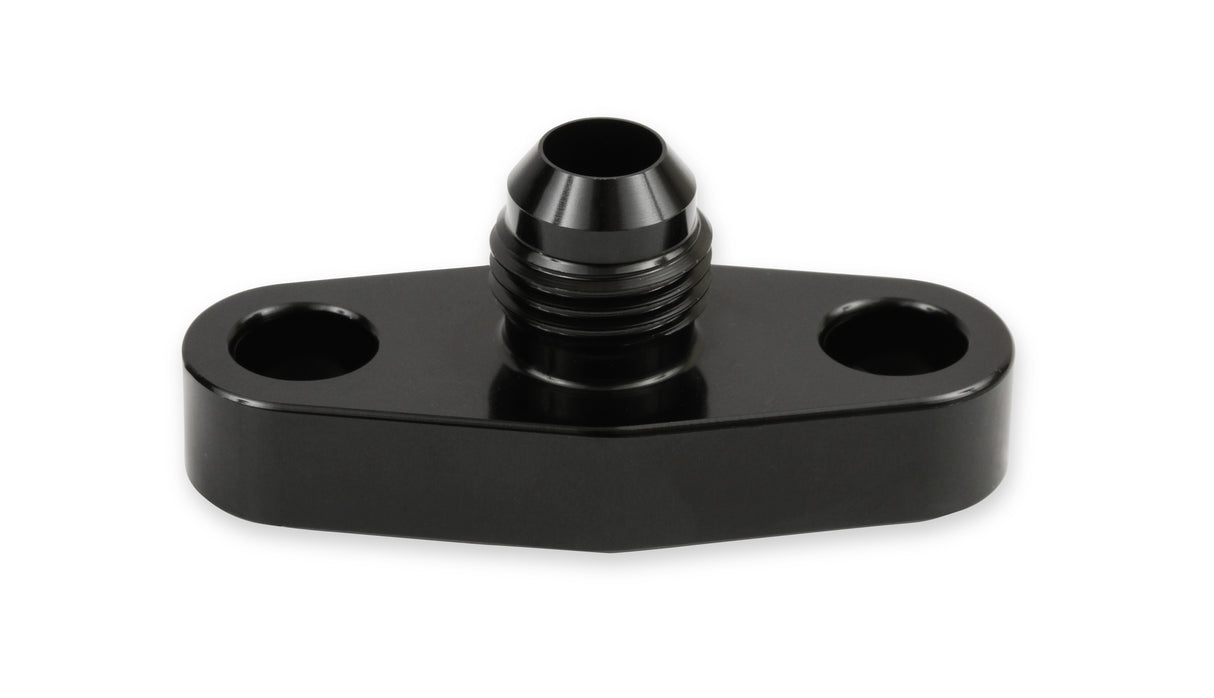Turbo Oil Supply Flange Fitting, -6 AN Male Flare, Bolt Spacing 1.5", w/ O-Ring Seal, Fits T40, 2024 Aluminum w/ Black Anodized Finish