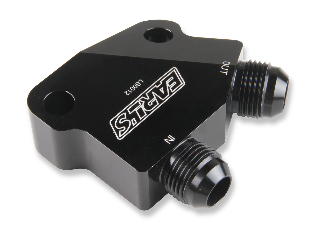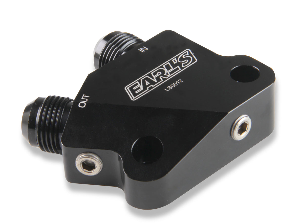 Earls's billet side mount oil cooler adapters are the slick way to add an oil cooler to your GM LS or Gen V-LT engine. The slim design of these adapters clear most headers and other components and feature -10AN male connections. These adapters are black anodized and use O-Ring seals for a leak free installation. The Gen-V LT adapter fits the Corvette & truck applications only. The Gen-V LT truck engines require an extra spacer